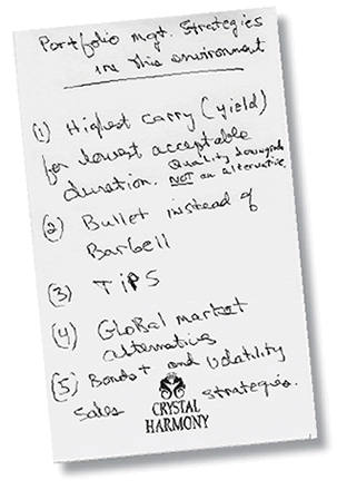 I hesitate to elaborate in much detail. There’s a certain simplicity to these notes – they may not tell it all, and they may in fact be proved wrong, but they sort of lay it out there rather succinctly and certainly quickly. Let me just add that the referenced “reflation” in a “financed based economy” may take years to engineer. As our May Secular Forum suggested, there are substantial structural impediments – “wet logs” – that will make it difficult for reflation to catch fire. Strong cyclical economic recoveries may be a thing of the past until high global debt levels are diluted via reflation, and the negative competitive influence of China and India is lessened via currency revaluation. These and other wet logs may prevent a “quick start” to government’s inflationary efforts. Nonetheless, the high tide for bond (and stock) investors has already taken place, although at different times. Mid-year of 2000 is an obvious high water mark for stocks and June of 2003 is a likely one for bonds. Both bond and equity strategies should begin with the assumption of low, single digit returns for the next decade and then be engineered to improve on those returns by 1% or so annually. My “Crystal Harmony” note pad lists those strategies which currently represent opportunities to do just that in the bond market.