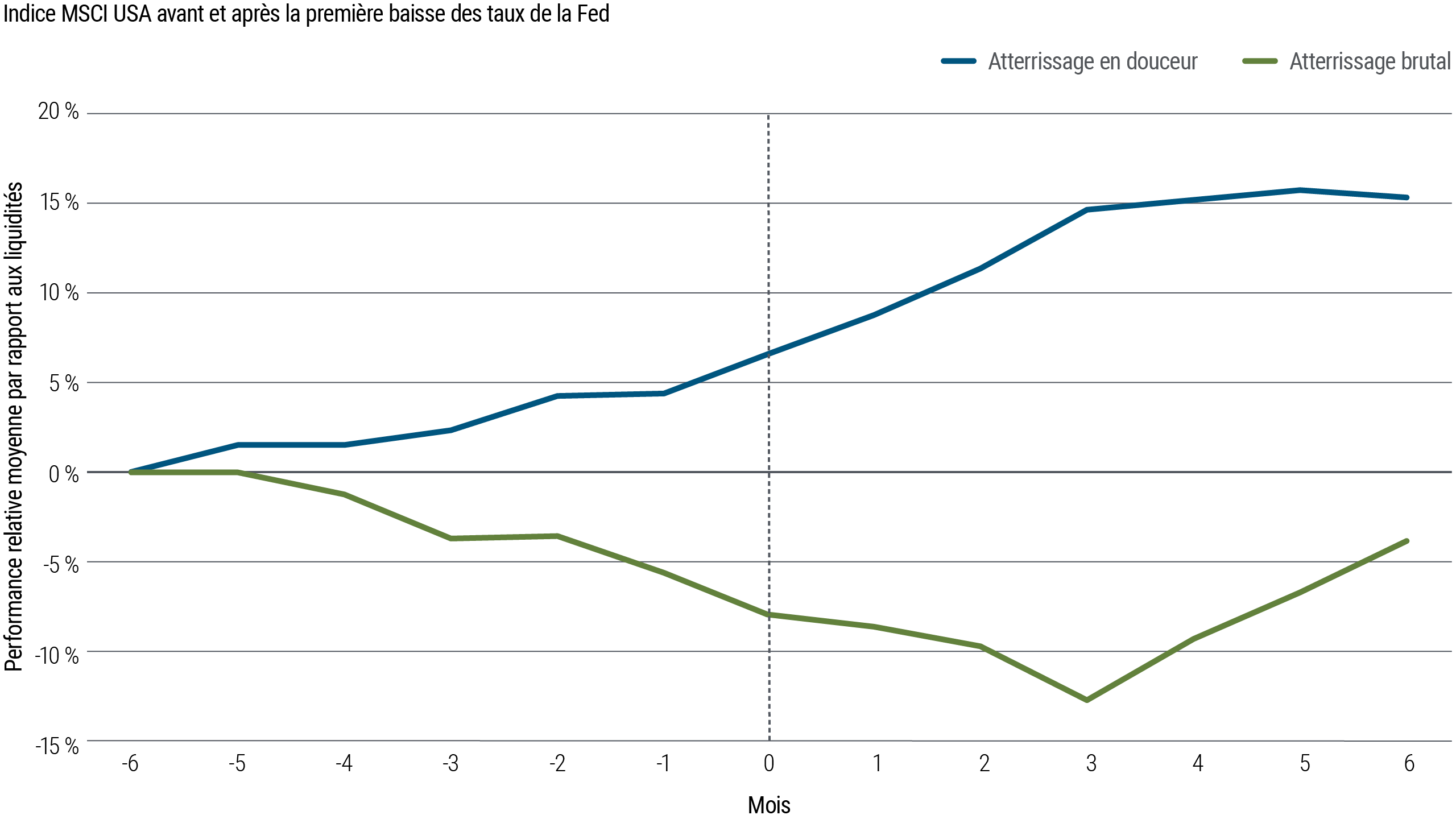 Que le contexte soit celui d'un atterrissage brutal ou d'un atterrissage en douceur, la première baisse de taux d'un cycle stimule généralement la performance des actions, du moins au cours du premier mois, car les baisses de taux tendent à doper le sentiment et l'activité économique réelle. Peu après cela dit, les marchés actions s'alignent habituellement sur l'environnement macroéconomique en vigueur.