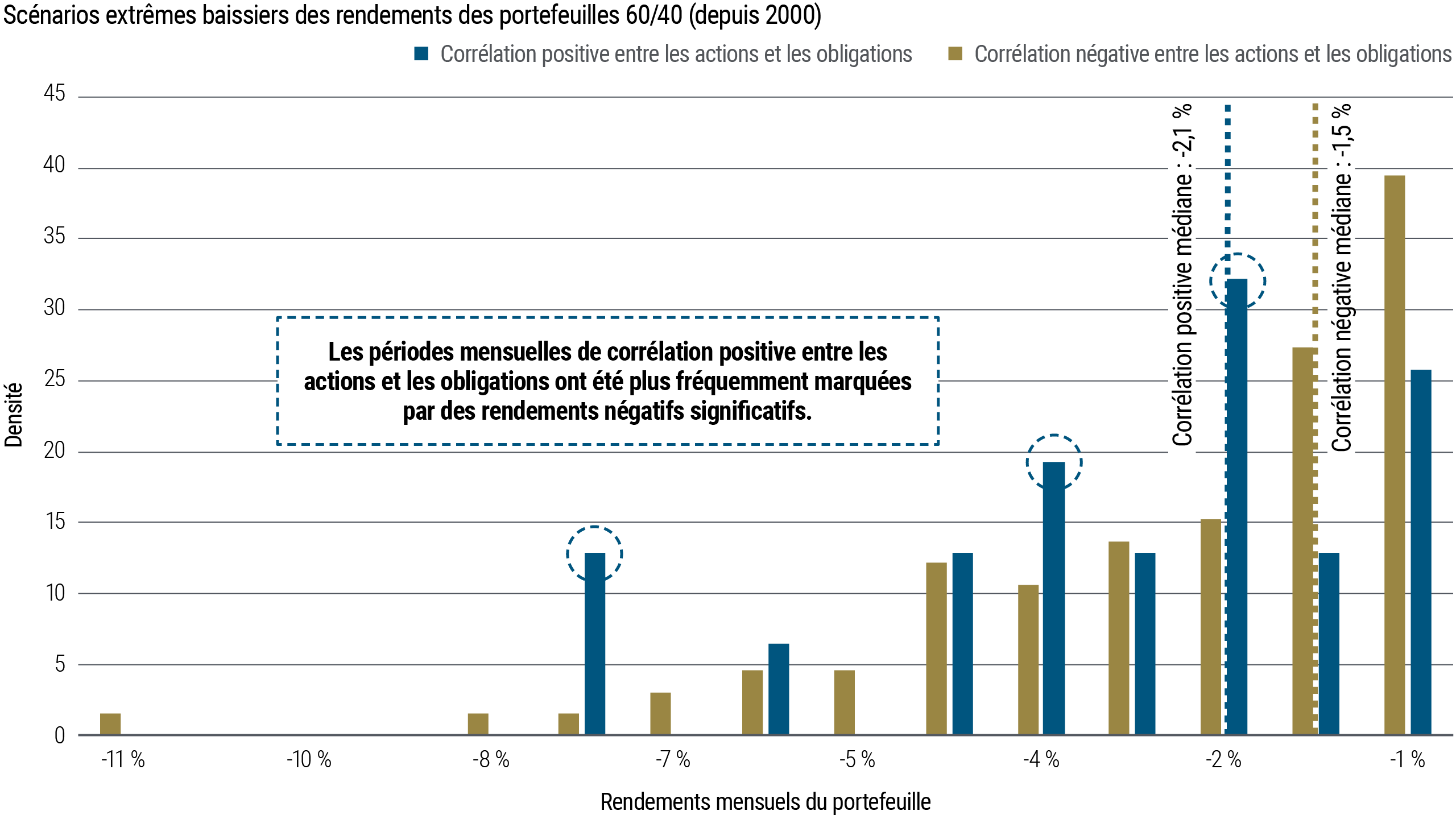 Si l'on examine les scénarios extrêmes historiques de rendements négatifs au sein d'un portefeuille multi-actifs simple composé à 60 % d'actions et à 40 % d'obligations, les avantages d'une corrélation actions-obligations négative apparaissent clairement (voir Figure 3). Les périodes de corrélation positive entre les actions et les obligations débouchent généralement sur des résultats extrêmes négatifs plus marqués pour les portefeuilles multi-actifs que les périodes de corrélation négative. Cela est vrai même si la plupart des récessions s'accompagnent de corrélations actions-obligations largement négatives, dès lors que les corrections des actions se voient partiellement compensées par les gains obtenus grâce à l'allocation obligataire.