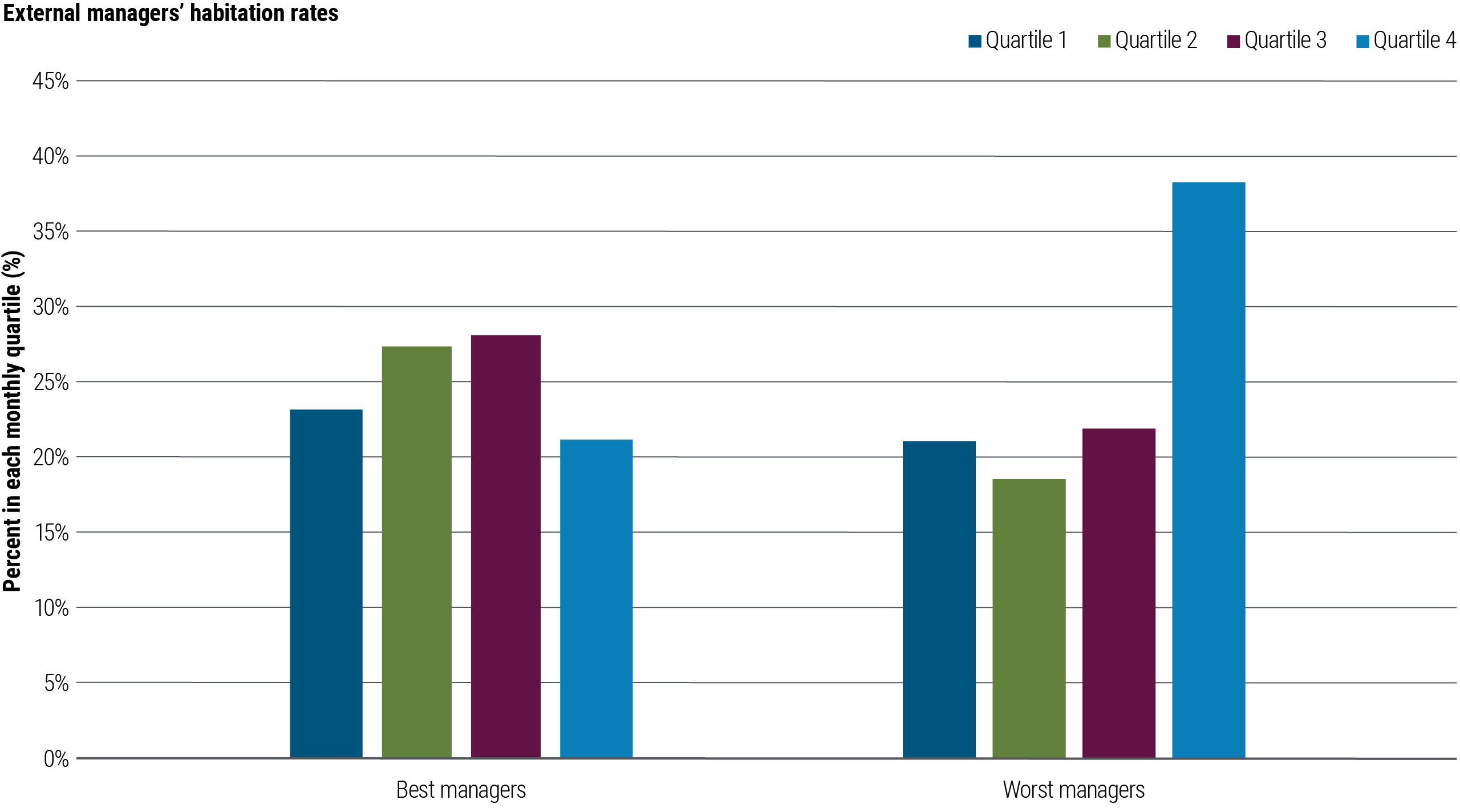 The best and worst investors had about the same frequency of 1st-quartile monthly returns (23% versus 21%, respectively). But the best investors had a dramatically lower frequency of bad months. They experienced 4th-quartile monthly returns 21% of the time, versus 38% for the worst managers.