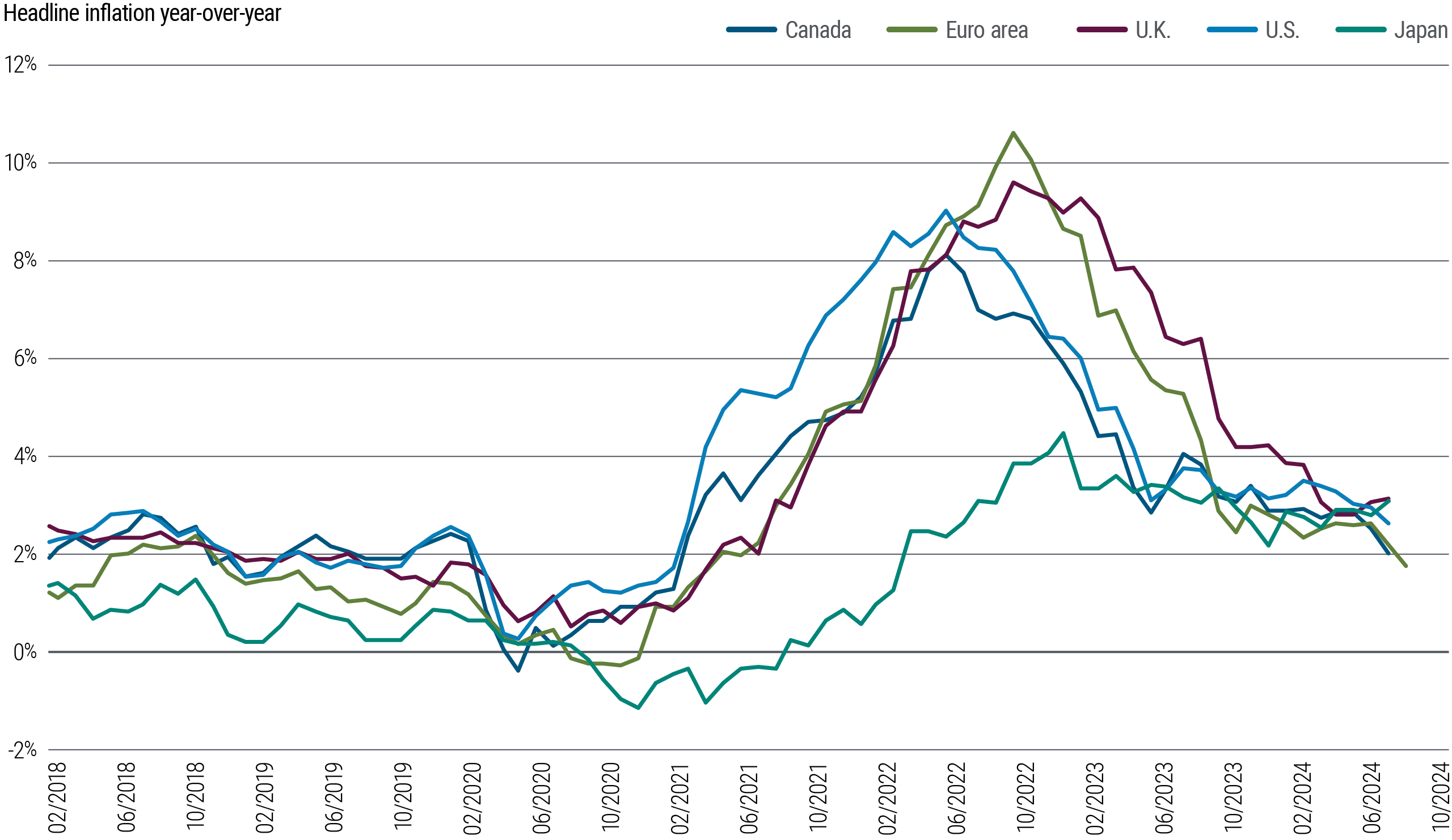 We expect China’s growth to slow to 4%–4.5% in 2025 from 5% in 2023 and 2024, while the country continues to export deflation globally. Demand for commodities, especially related to construction, may get some support from the recently announced policies but isn’t likely to rise as much as in past cycles, given controls on new housing supply.