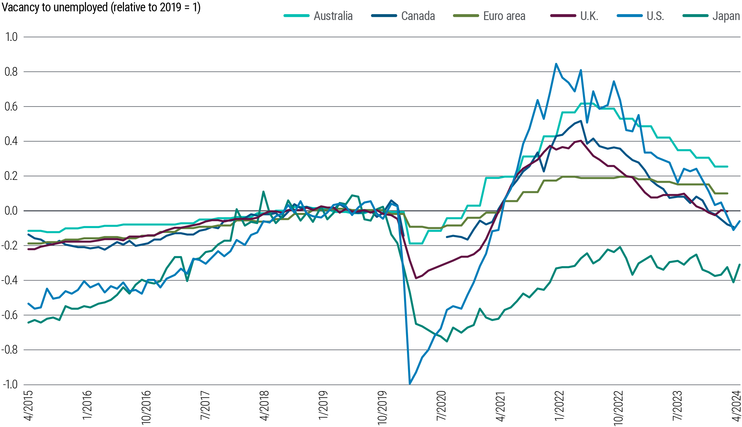 More resilient U.S. growth and inflation delayed the Federal Reserve in commencing its rate-cutting cycle relative to other central banks. However, forward-looking inflation indicators suggest that further progress toward the Fed’s 2% inflation target is likely in 2025. Factors supporting this outlook include unit labor cost inflation nearer to 2%, a vacancy-to-unemployed ratio lower than 2019 levels (see Figure 2), and a rising unemployment rate that may risk overshooting the Fed’s comfort zone of around 4.2%.