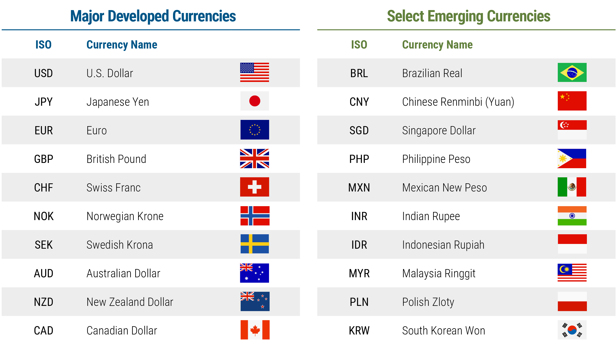 Currency describes the money or official means of payment in a country or region. The best-known currencies include the U.S. dollar ($), euro (€), Japanese yen (¥), British pound (£), and Swiss franc. While currency symbols exist for most currencies, the foreign exchange (FX) markets use ISO (International Organization for Standardization) codes to identify currencies. Some of these ISO codes are included in the chart below: