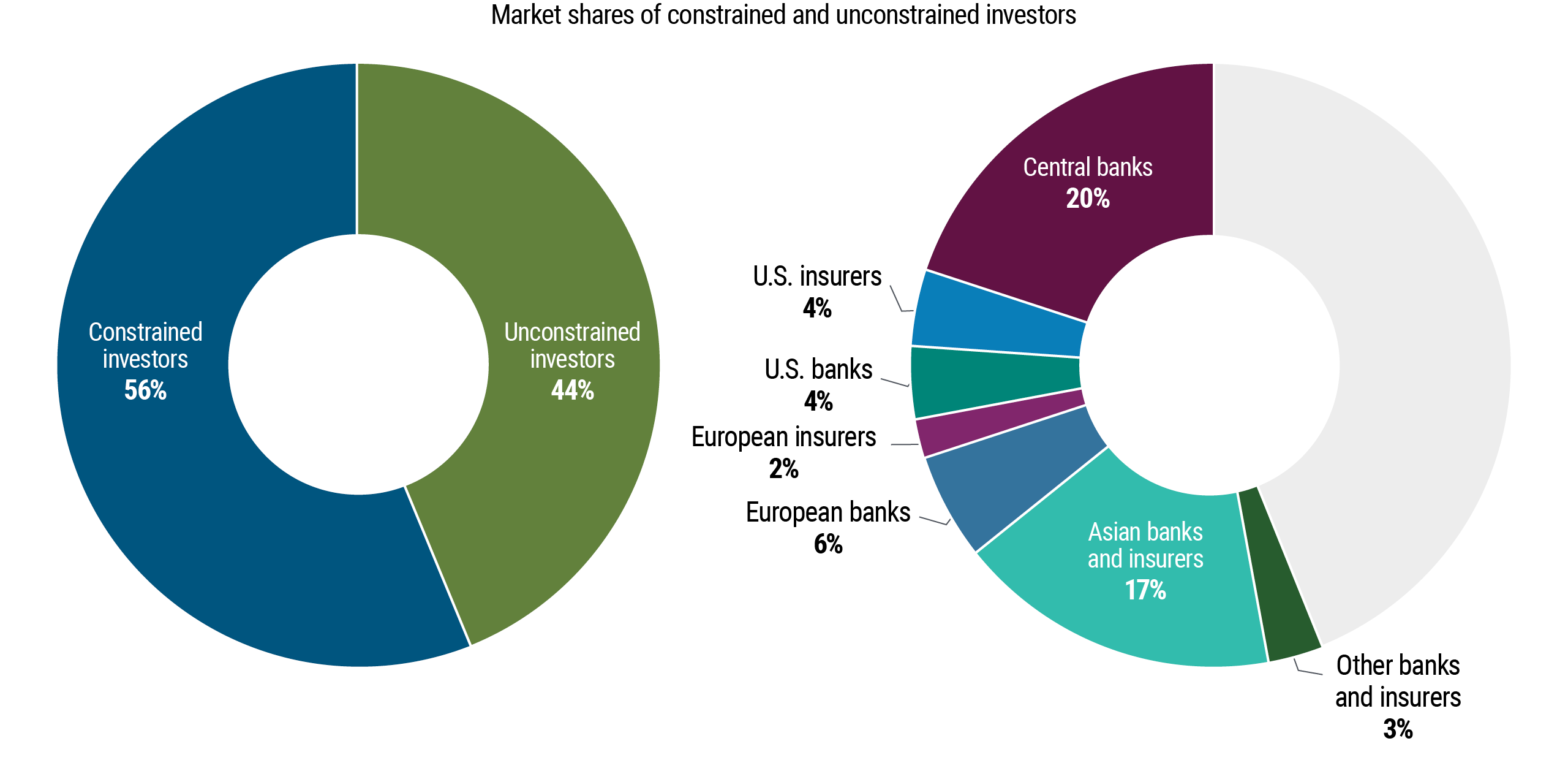 Although the logic may be unassailable, it may not fully apply in fixed income because roughly half of active bond investors are constrained investors whose investment objectives are not solely to optimize the trade-off between risk and return. For example, central banks trade bonds to influence rates, currencies, economic growth, and asset prices, while commercial banks and insurance companies often prioritize book yield over total return due to accounting rules, regulations, or a preference for predictable, low-turnover portfolios (see Figure 2).