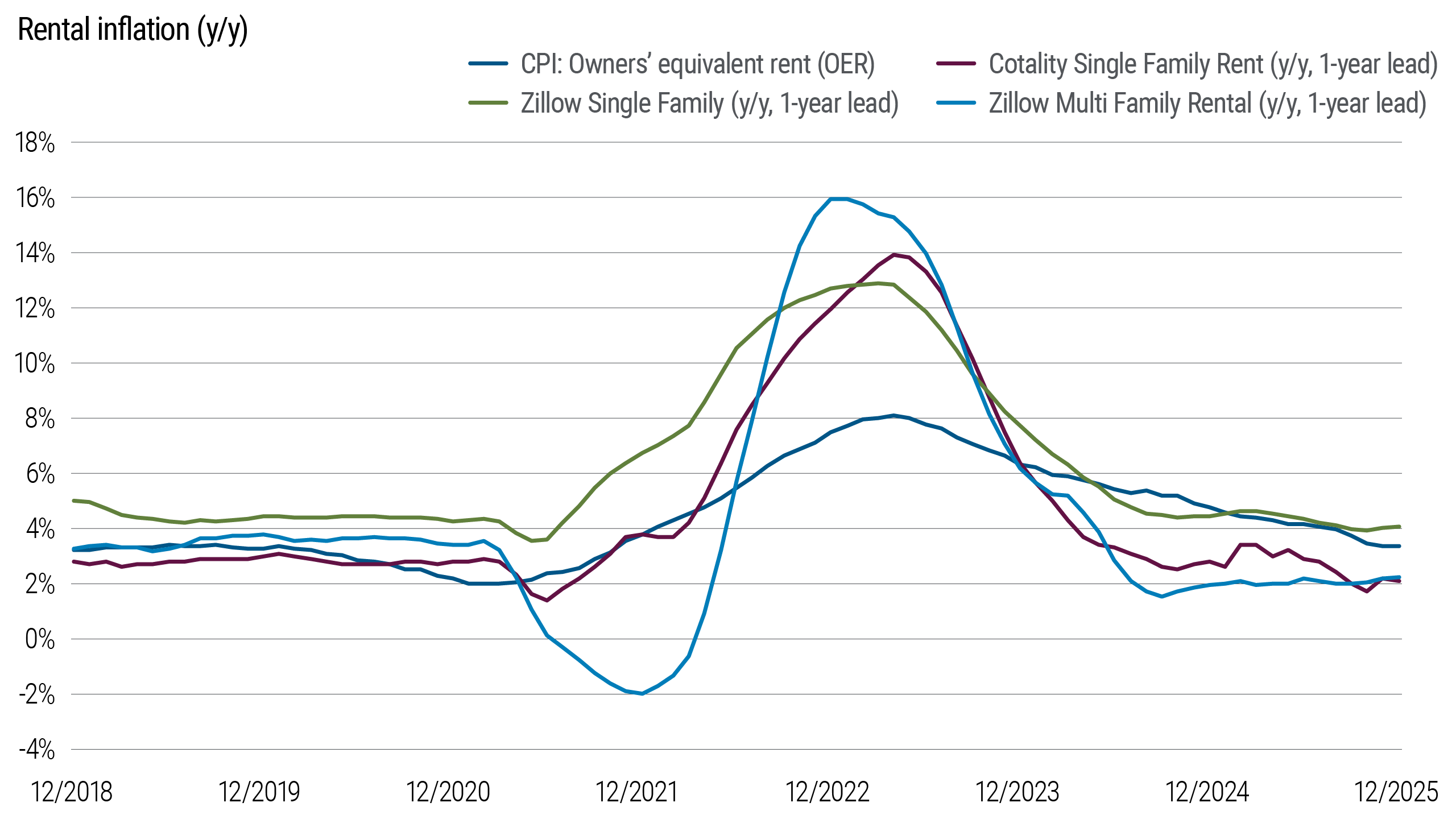 At the same time, rental inflation is decelerating fast. Zillow’s new lease data show rents rising at a rate of 2.1% annually, which is almost 50% lower than the pre-COVID norm. Single family rental inflation as measured by Cotality is even lower, growing below 1% annually for the first time since the GFC. The gap between new lease rental rates and renewal rental rates has also largely normalized, alleviating another persistent source of inflation within the rental market.