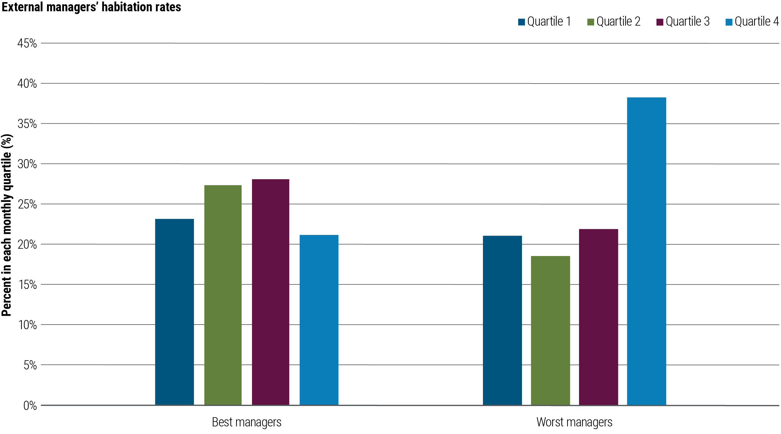 The best and worst investors had about the same frequency of 1st-quartile monthly returns (23% versus 21%, respectively). But the best investors had a dramatically lower frequency of bad months. They experienced 4th-quartile monthly returns 21% of the time, versus 38% for the worst managers.