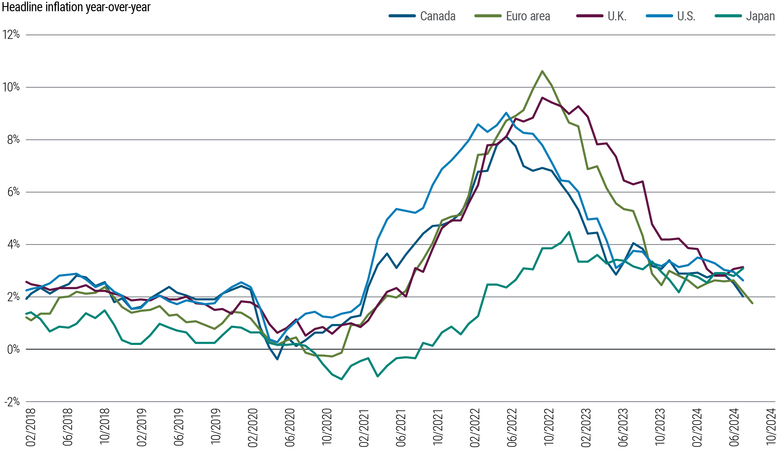 We expect China’s growth to slow to 4%–4.5% in 2025 from 5% in 2023 and 2024, while the country continues to export deflation globally. Demand for commodities, especially related to construction, may get some support from the recently announced policies but isn’t likely to rise as much as in past cycles, given controls on new housing supply.