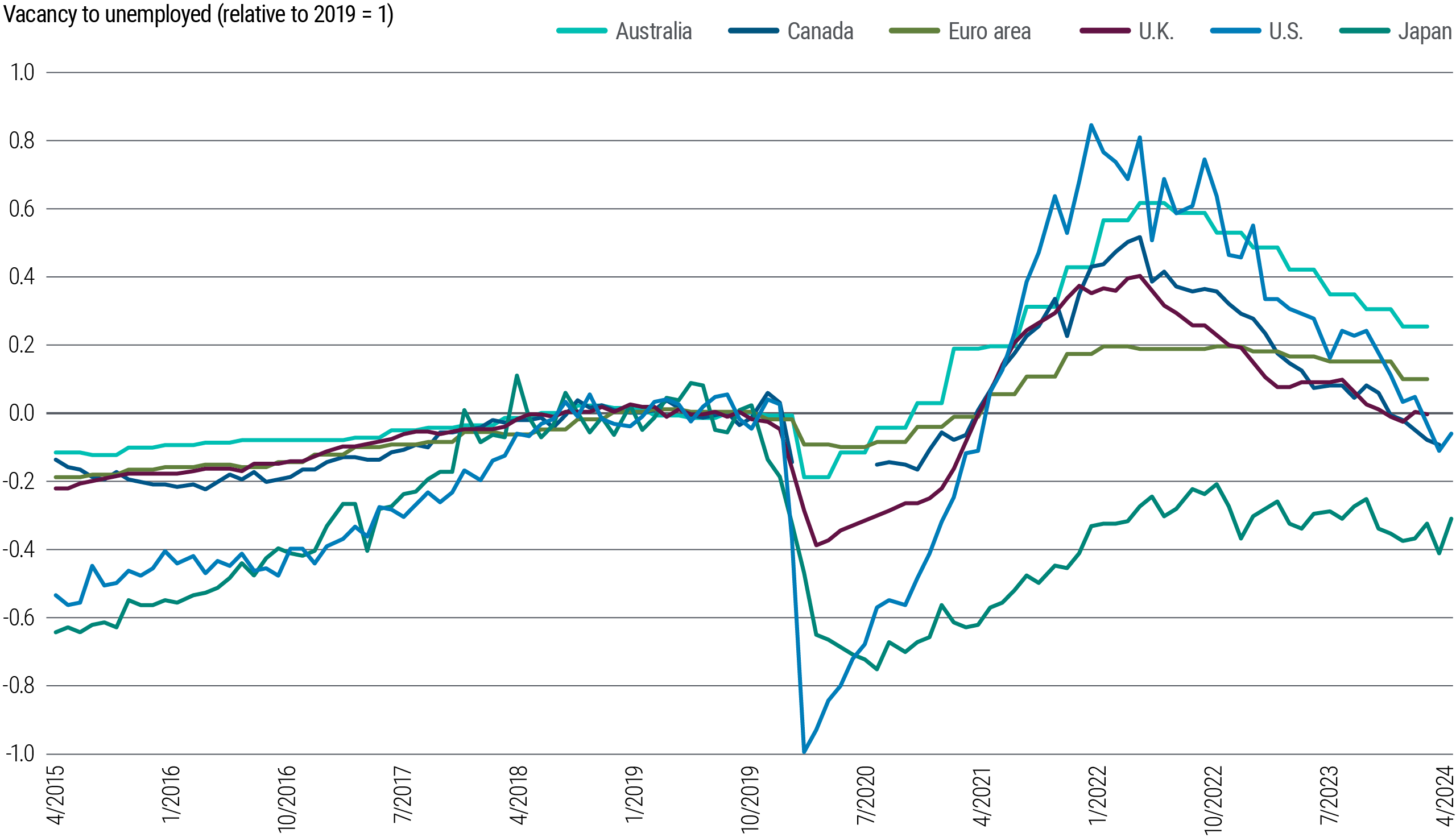More resilient U.S. growth and inflation delayed the Federal Reserve in commencing its rate-cutting cycle relative to other central banks. However, forward-looking inflation indicators suggest that further progress toward the Fed’s 2% inflation target is likely in 2025. Factors supporting this outlook include unit labor cost inflation nearer to 2%, a vacancy-to-unemployed ratio lower than 2019 levels (see Figure 2), and a rising unemployment rate that may risk overshooting the Fed’s comfort zone of around 4.2%.