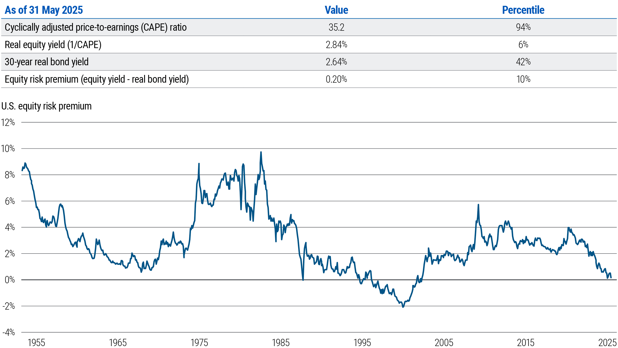 A mean reversion to a higher equity risk premium typically involves a bond rally, an equity sell-off, or both. The same chart shows two prior times when the premium was zero or negative: in 1987 and in 1996–2001. Following the zero equity risk premium in September 1987, the stock market declined by almost 25%, while 30-year real bond yields fell by 80 basis points (bps). In December 1999, the equity risk premium reached its minimum level during the chart period, preceding an equity drawdown of almost 40% that ended in February 2003. In that same time, 30-year real bond yields fell by about 200 bps.