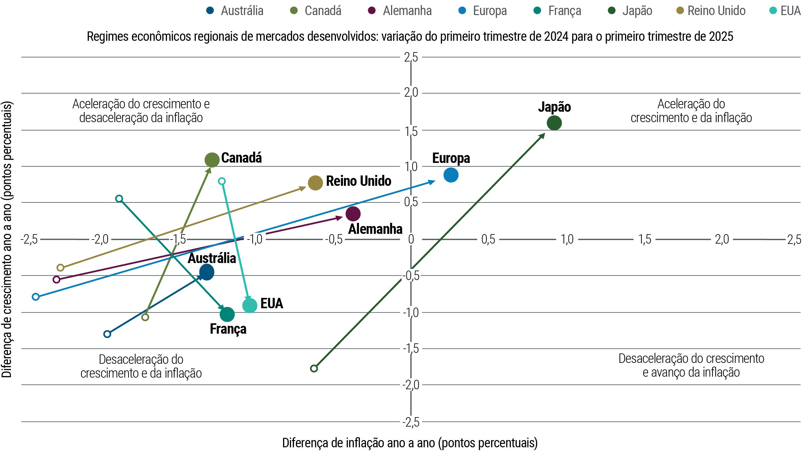 Os efeitos das mudanças nas políticas comerciais e fiscais ainda não estão claros nos dados macro, e as próprias políticas estão evoluindo rapidamente. De qualquer forma, está claro que o excepcionalismo americano está desaparecendo: Nossos rastreadores de ciclo de negócios mostram um ritmo de crescimento mais lento que contrasta com a reaceleração vista na maioria das outras economias de mercados desenvolvidos (ver Figura 2).
