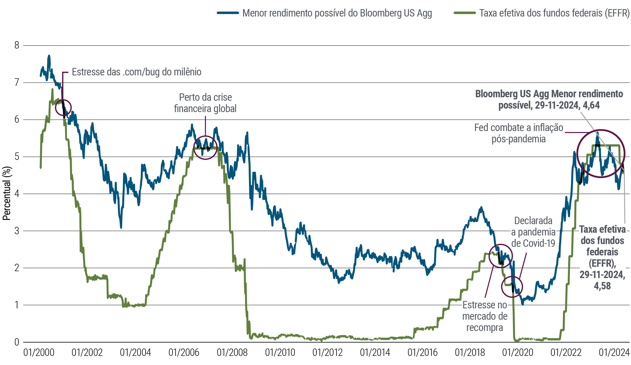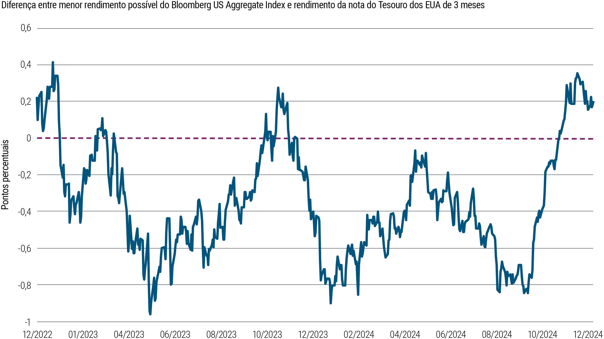 Paralelamente, os rendimentos dos títulos tiveram alta substancial em relação aos níveis mínimos da época da pandemia. Na comparação com cash, que tem queda nos rendimentos ao passo que os juros diminuem, os títulos oferecem uma oportunidade mais atraente. A Figura 2 ilustra isso ao comparar o rendimento de um importante índice de renda fixa com o rendimento das notas do Tesouro dos EUA com vencimento em 3 meses, que funciona como referência para aplicações em cash. Tanto a renda fixa quanto cash ofereceram rendimentos atraentes nos últimos dois anos, mas por definição não é possível travar esses níveis de rendimento de cash por períodos mais longos. Desde setembro, quando o Fed baixou a taxa básica de juros em 50 pontos-base (p.b.), a perspectiva dos rendimentos de cash em relação à renda fixa tradicional diminuiu drasticamente.