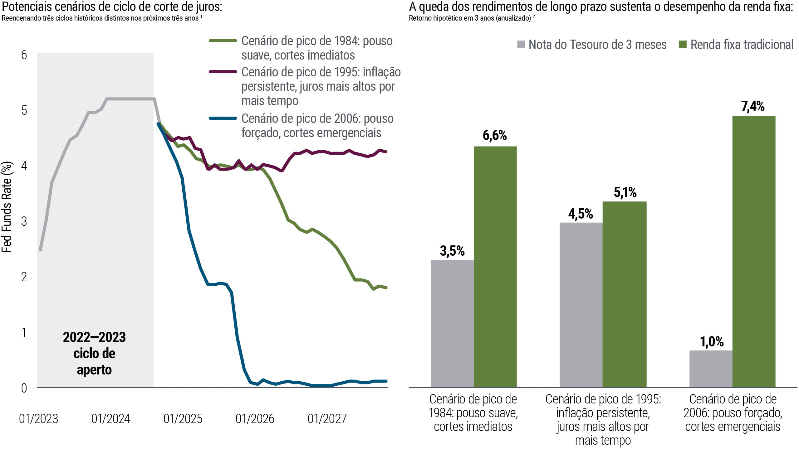 Além disso, os títulos de renda fixa estão bem posicionados para enfrentar uma variedade de situações diferentes do cenário-base. Historicamente, títulos de alta qualidade têm bom desempenho durante pousos suaves e desempenho ainda melhor em quadros de recessão — se este for o caso. Conforme a Figura 3, os títulos também mostraram bom desempenho em uma variedade de cenários de redução de juros (afinal, todo ciclo monetário tem suas particularidades). Tanto em casos de abordagem muito gradual pelo Fed (“juros mais altos por mais tempo”), de início do ciclo com uma queda drástica ou de abordagem intermediária entre esses extremos, a renda fixa depois rendeu mais do que aplicações em cash em cada um desses ambientes de juros.