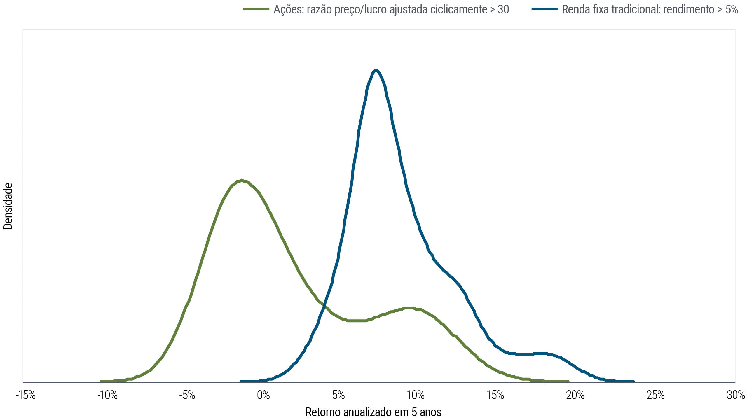 As tendências históricas também dão sustentação aos títulos como atraente hedge de risco. Analisamos os mercados de títulos e ações desde 1973, durante períodos em que os títulos tradicionais dos EUA renderam 5% ou mais e a razão preço/lucro das ações esteve acima de 30, como é o caso atualmente. Nessas situações, os títulos ofereceram maiores retornos subsequentes em cinco anos (Figura 4) e com volatilidade potencialmente menor.