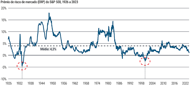 Analisando mais a fundo os dados históricos, constatamos que, no século passado, apenas em poucas ocasiões as ações dos EUA ficaram mais caras do que a renda fixa, como durante a Grande Depressão e na crise das dot-com. Uma forma comum de medir o valuation relativo dos títulos de renda fixa e das ações é o ERP. Há várias formas de calcular o ERP, mas aqui usamos o preço/lucro invertido do S&P 500 menos o rendimento dos Títulos de 10 anos do Tesouro dos EUA. O ERP está hoje pouco acima de 1% – um nível baixo como esse não é visto desde 2007 (ver Figura 2). A história sugere ser provável que as ações não permaneçam tão caras em relação aos títulos de renda fixa; acreditamos que este pode ser o momento ideal para considerar um overweight em renda fixa nas carteiras de alocação de ativos.