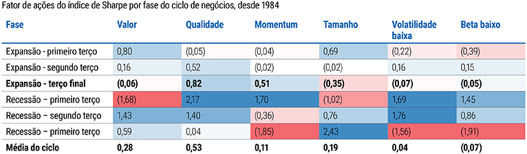 Em tempos de incerteza, preferimos investir em ações de qualidade. Historicamente, o fator qualidade tem sido uma opção atraente na fase final do ciclo de negócios (ver Figura 5). Dentro de nossa posição geral neutra, estamos overweight em ações dos EUA (S&P 500), que apresentam mais características de qualidade do que as de outras regiões, principalmente as dos mercados emergentes. Além disso, o crescimento europeu pode ser mais problemático que o dos EUA, de forma que estamos underweight no mercado de ações local, apesar de seu valuation mais atraente.
