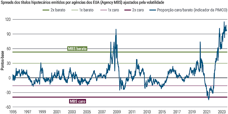 Em contraste ao crédito corporativo, é possível encontrar spreads atraentes em hipotecas e títulos securitizados. Temos uma alocação elevada em títulos hipotecários emitidos por agências dos EUA (Agency MBS), que são líquidos, de alta qualidade e negociados com valuations bastante atraentes (ver Figura 6). Também vemos valor em posições sênior em determinados ativos securitizados, como CLO (collateralized loan obligations, obrigações de empréstimos garantidos) e CMO (collateralized mortgage obligations, obrigações de hipotecas garantidas).