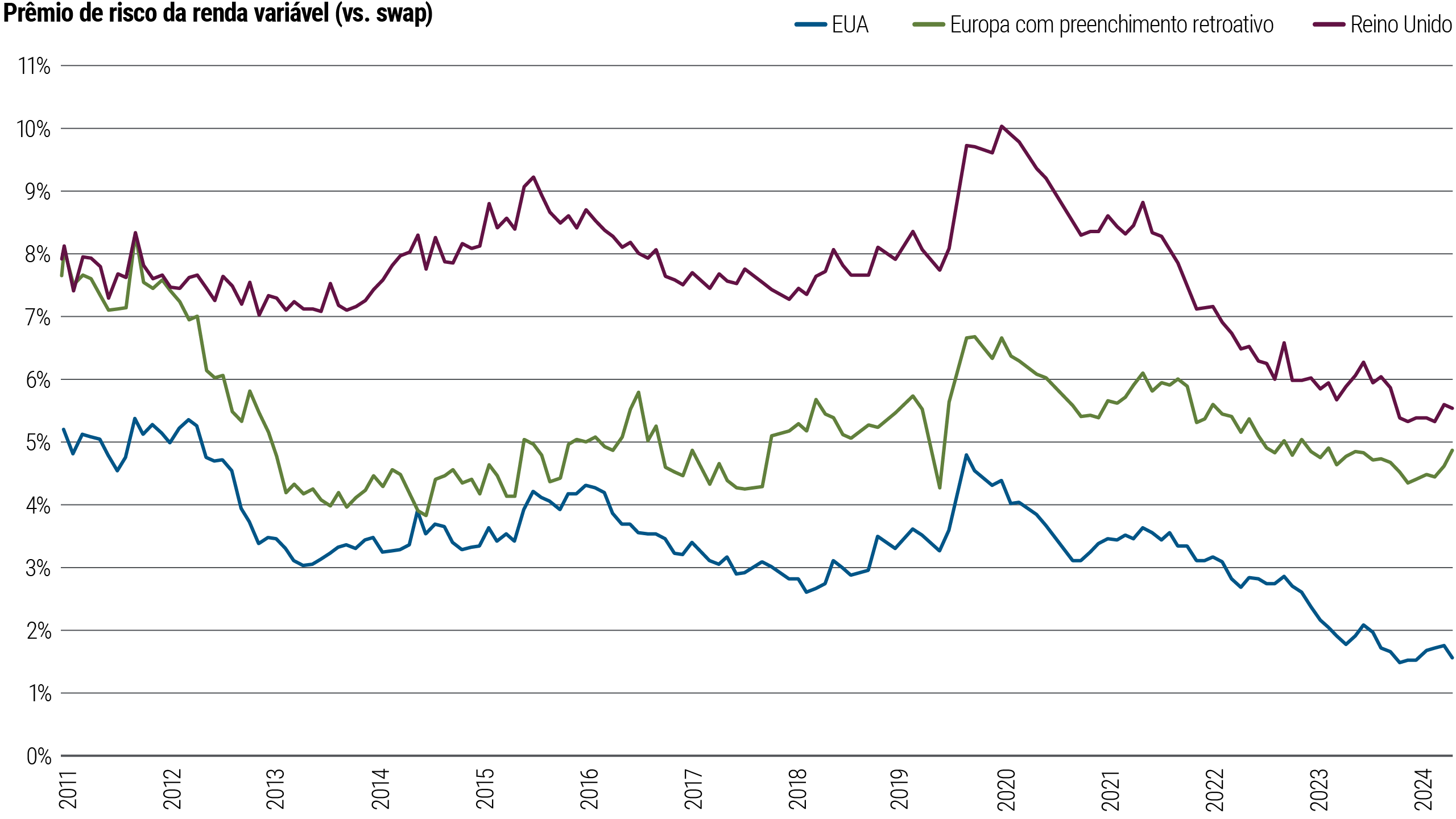 O estímulo fiscal ajudou na recuperação econômica dos EUA no pós-pandemia, ao mesmo tempo em que embalou os mercados de ações para níveis recordes. Embora as ações possam subir mais, as valuations parecem mais esticadas. O prêmio de risco da renda variável nos EUA - a compensação oferecida pelas ações sobre uma taxa livre de risco - está próximo dos menores patamares em registro (veja a Figura 1).