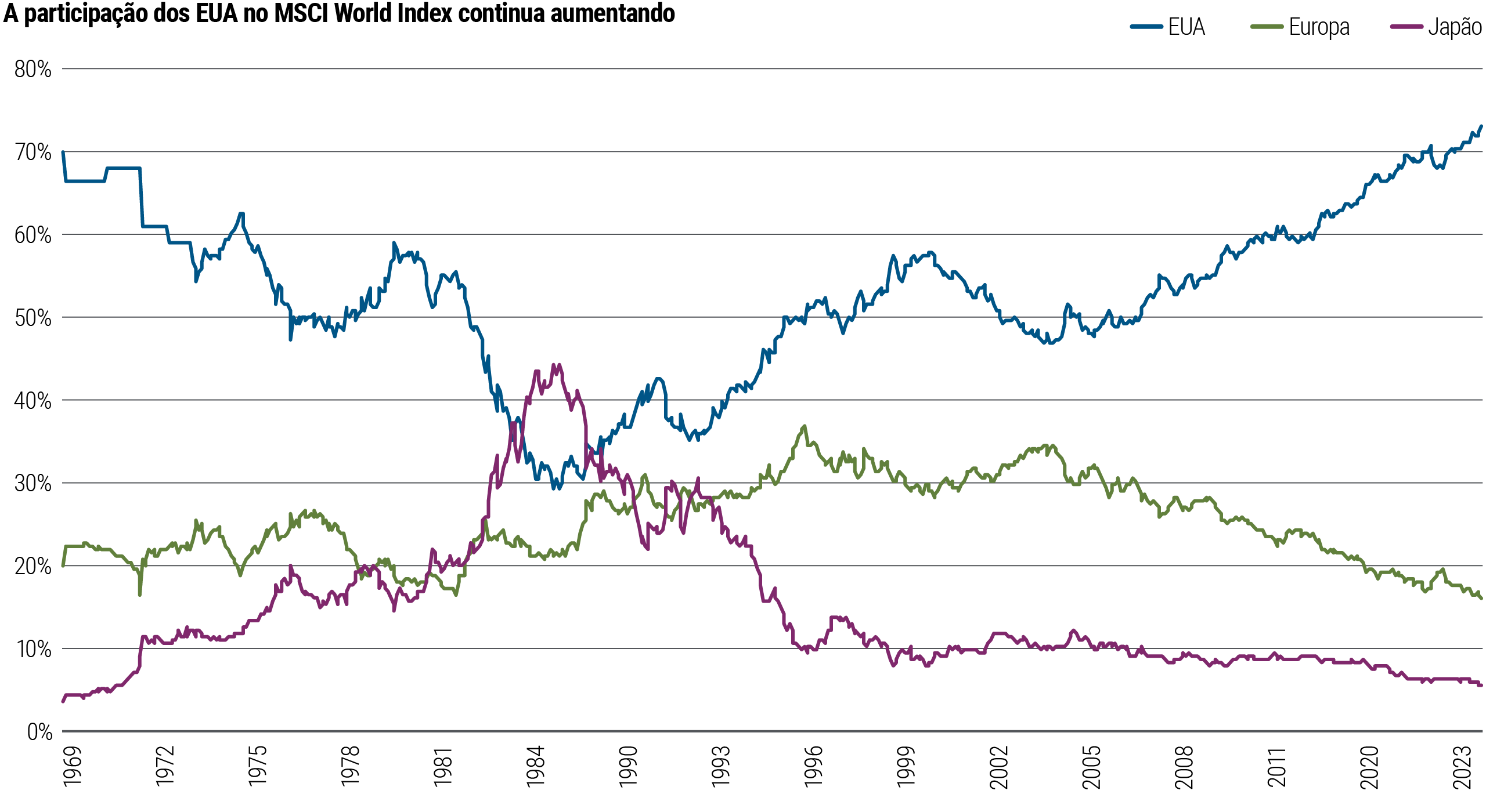 No fim das contas, os EUA podem mostrar resiliência, porém a incerteza aumenta à medida que a dívida fica cada vez maior. O contrato social dos EUA — um grande crescimento impulsionado pelo déficit — estimulou enormes ganhos de produtividade e tecnologia, que beneficiaram empresas e investidores em ações no país (veja a Figura 2). Portanto, acreditamos que faz sentido assumir exposição a ações nos EUA e optar por exposição a dívidas na Europa.