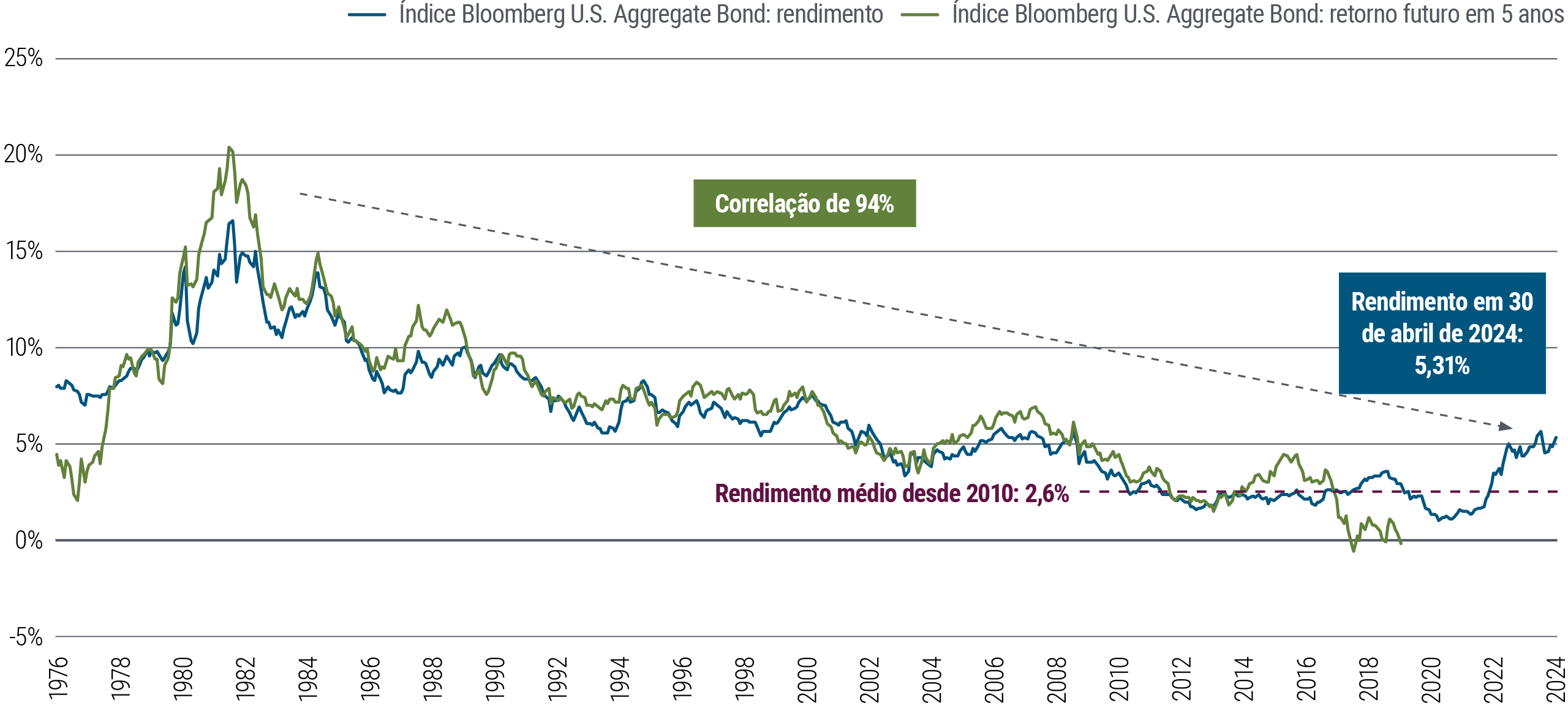 O choque inflacionário pós-pandemia e o subsequente ciclo de alta das taxas básicas de juros fizeram com que os rendimentos da renda fixa aumentassem drasticamente. Historicamente, os rendimentos iniciais são uma boa indicação dos retornos da renda fixa em um horizonte de vários anos (ver Figura 2). Em 30 de abril de 2024, os rendimentos dos índices Bloomberg U.S. Aggregate e Global Aggregate (com hedge em dólares dos EUA), duas referências para títulos de alta qualidade, estavam em 5,31% e 5,41%, respectivamente.