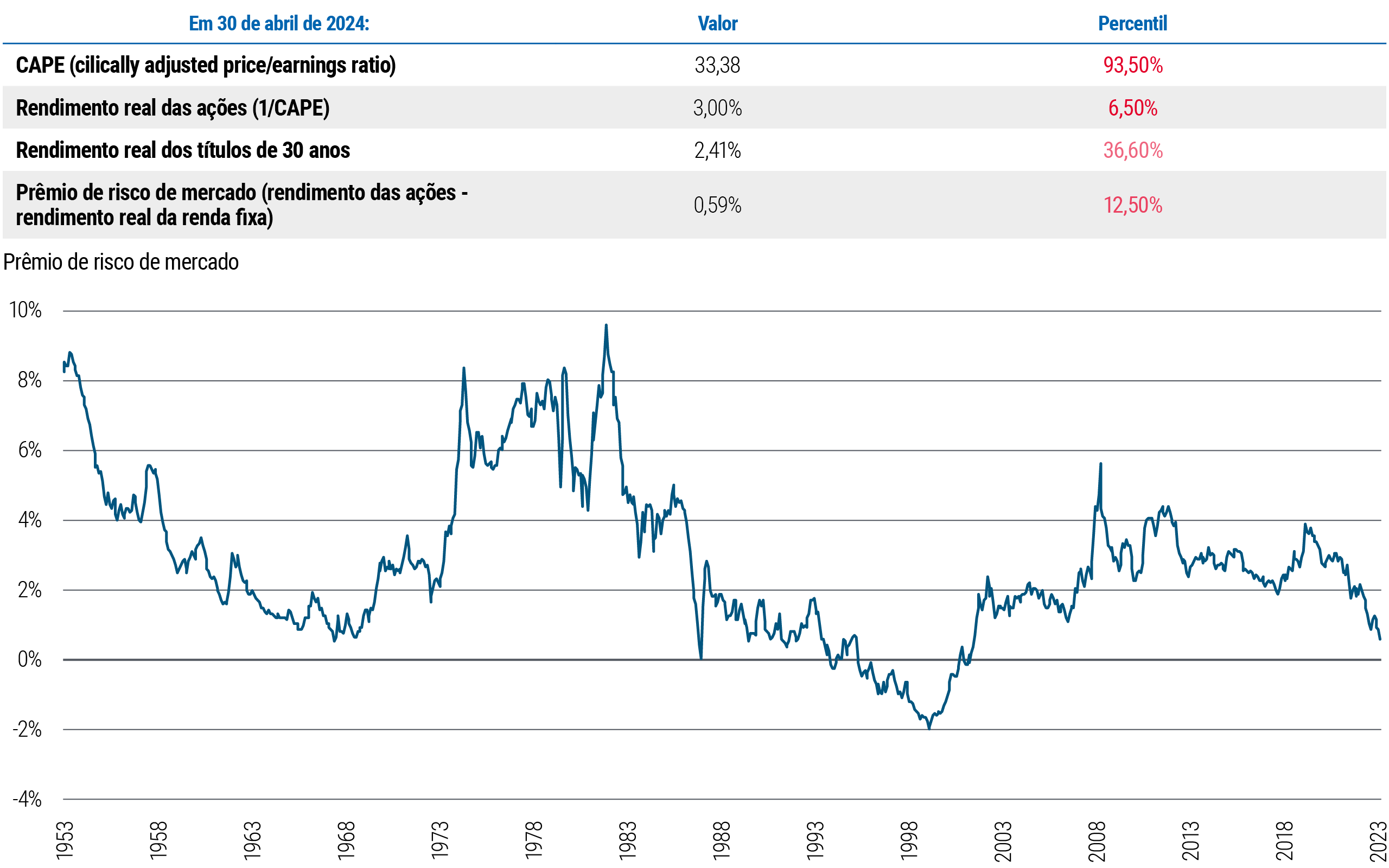 Como resultado, uma alocação diversificada em títulos de renda fixa tem o potencial de gerar retornos de longo prazo semelhantes aos das ações, mas com perfil de risco mais favorável, sobretudo se levarmos em conta os valuations exagerados dos mercados de ações (ver Figura 3). Os mercados aparentemente não consideram um risco significativo de recessão, o que significa que a renda fixa pode ser uma forma barata de proteção contra esse risco.