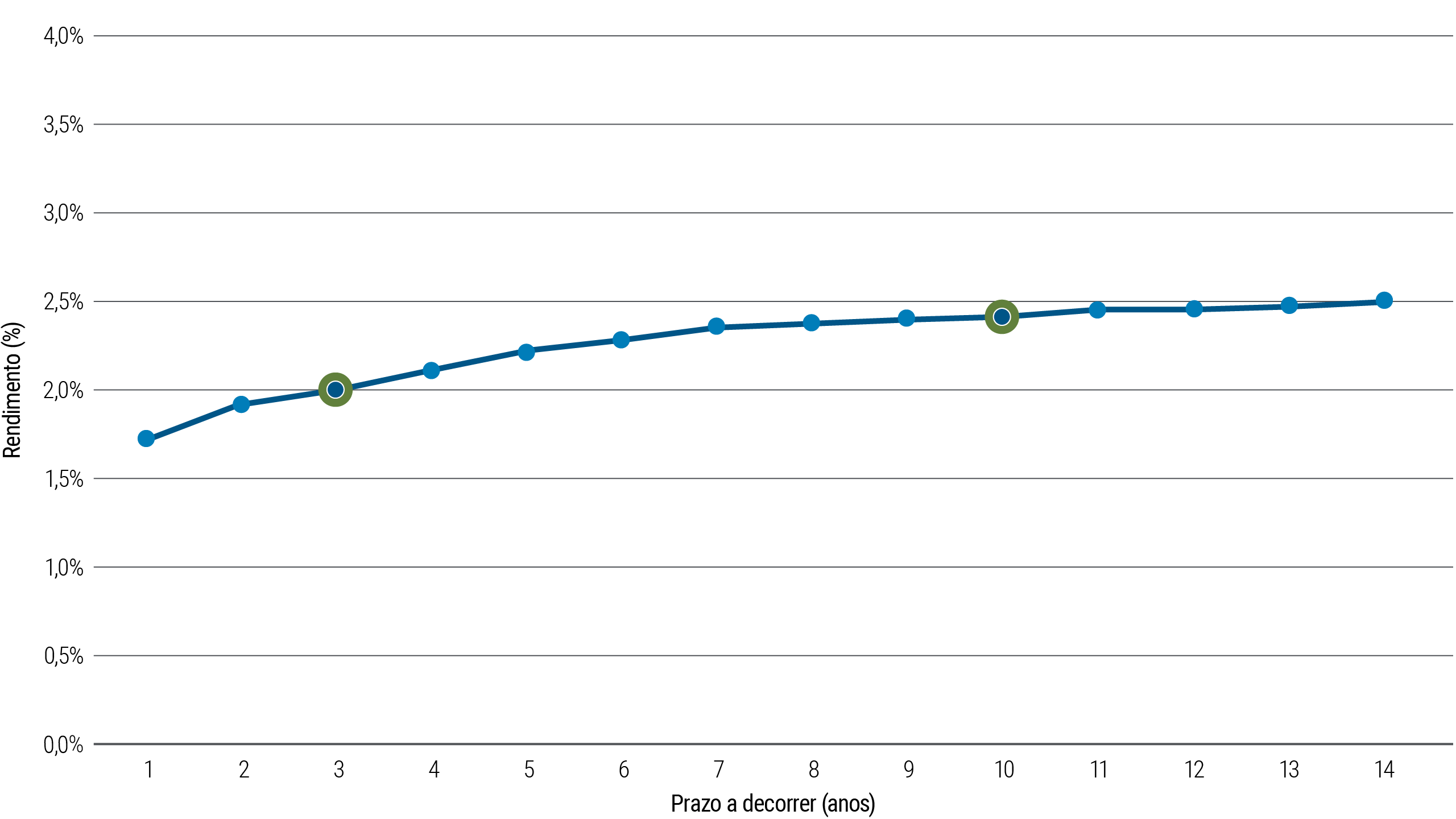 Por vezes, a curva de rendimentos se inverte e apresenta inclinação negativa, o que indica que o rendimento dos títulos de prazo mais longo são menores.