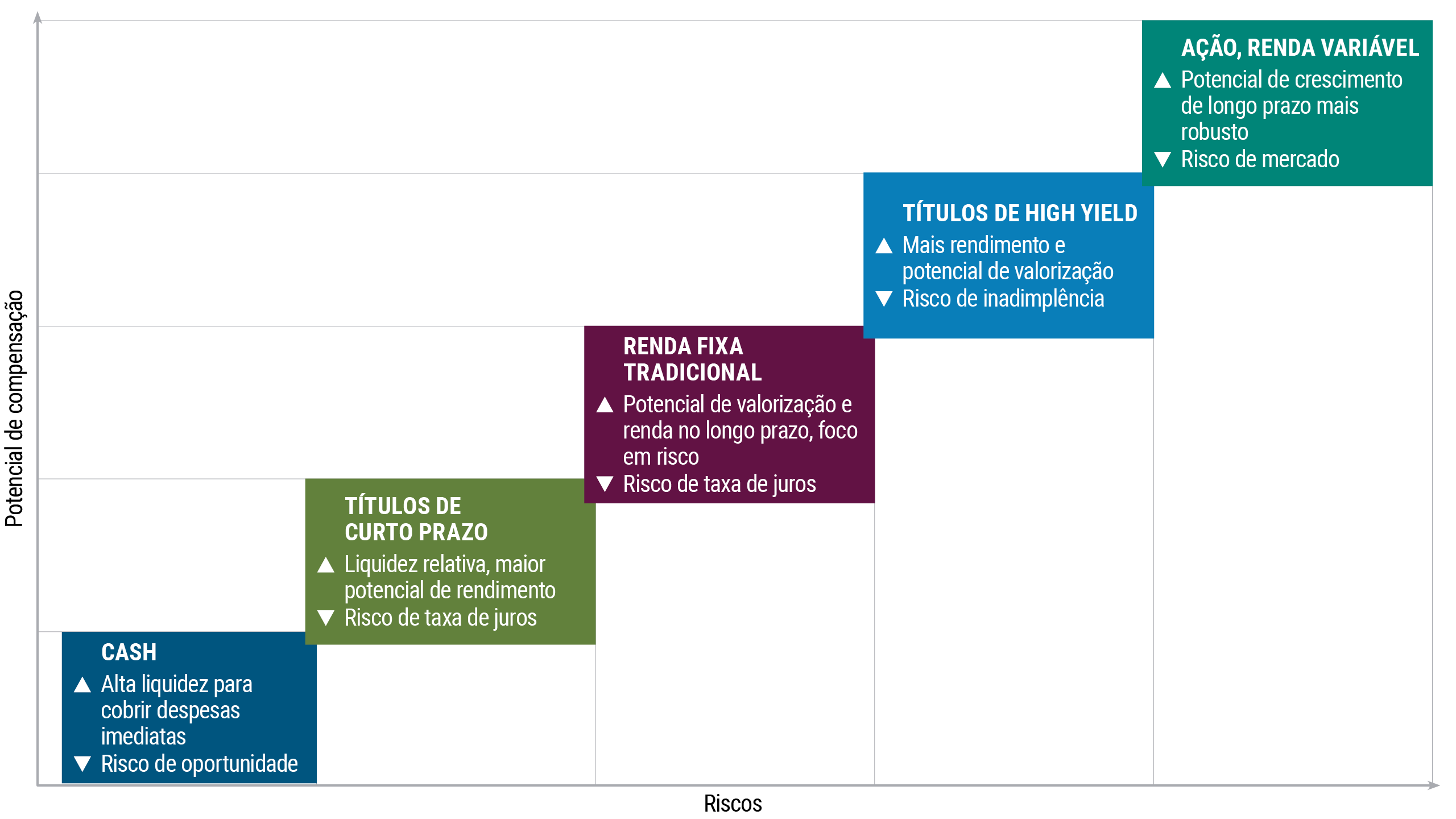 Cada classe de ativo tem seu próprio perfil de risco/retorno. Apesar de cash (dinheiro/investimentos de curto prazo) ser a classe que apresenta o menor risco, ela também é a que tem menos potencial de retorno. Por outro lado, ações e investimentos alternativos podem apresentar risco mais elevado, mas também oferecem um maior potencial de retorno.