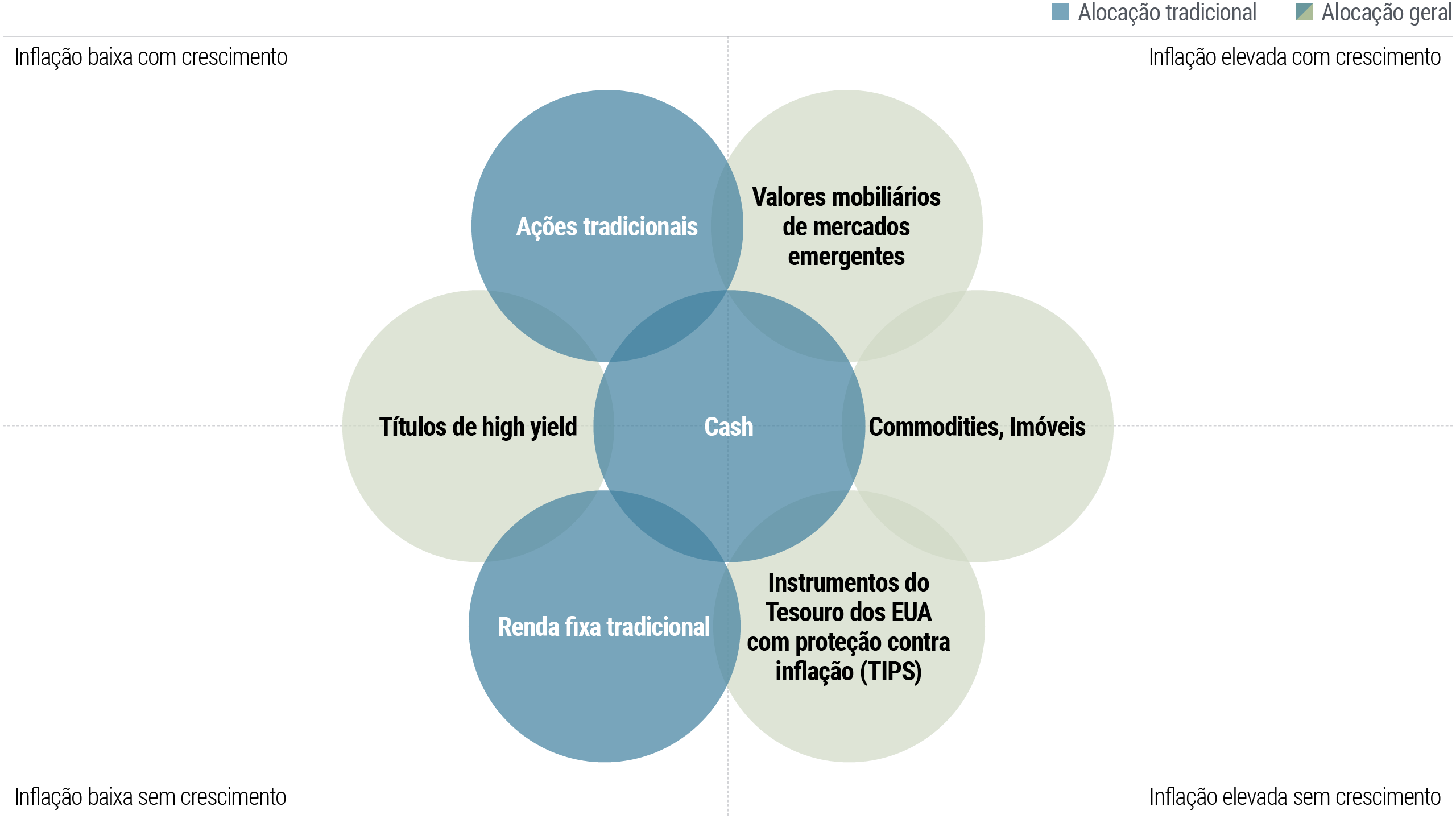 Por exemplo, em ambientes com inflação mais alta, ativos como imóveis e commodities podem ter um melhor desempenho (conforme ilustrado no gráfico abaixo).