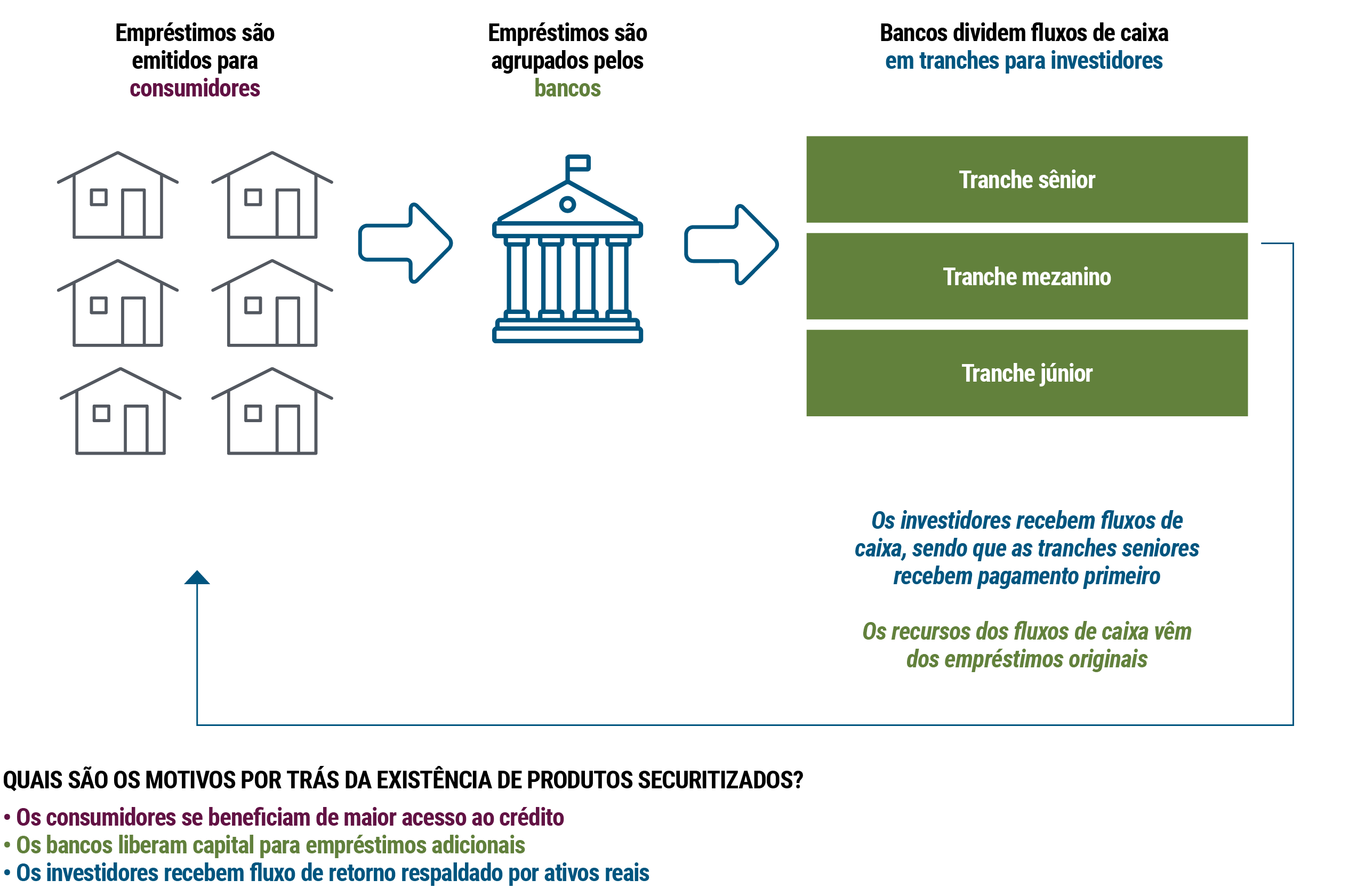 Por meio das securitizações, os originadores de empréstimos podem vender exposição, liberando capacidade para que efetuem novos empréstimos. Por sua vez, os investidores podem se beneficiar do tamanho e da escala do empréstimo agrupado para ter liquidez adequada no mercado público.