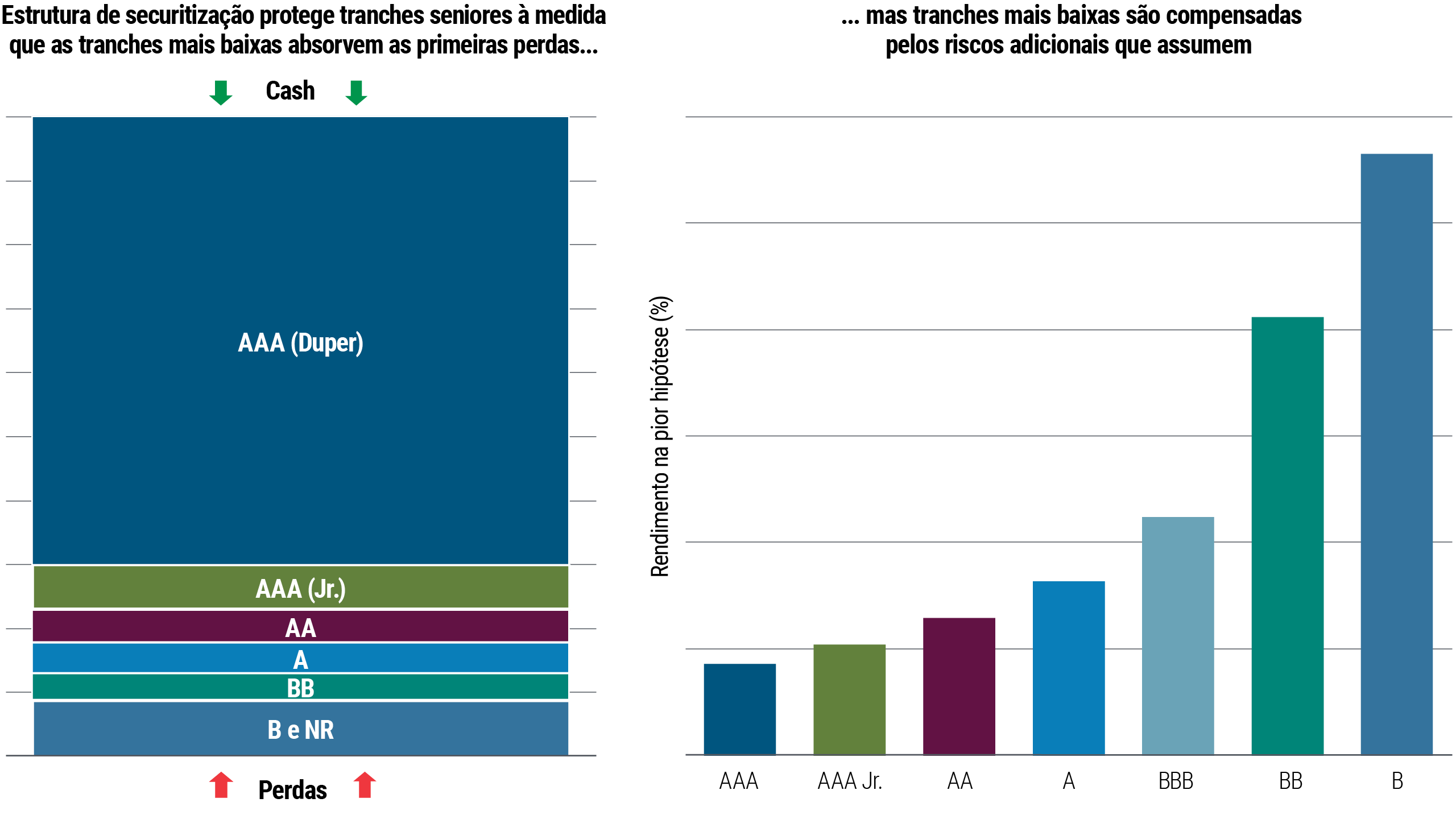 O gráfico abaixo à esquerda mostra que a estrutura de securitização é projetada para proteger as tranches seniores (com classificações de crédito AAA, AAA (Jr.), AA, A e BBB) contra perdas. No entanto, tranches juniores (com classificações de crédito BB e B) recebem compensação pelo risco adicional assumido, como mostra o gráfico abaixo à direita.