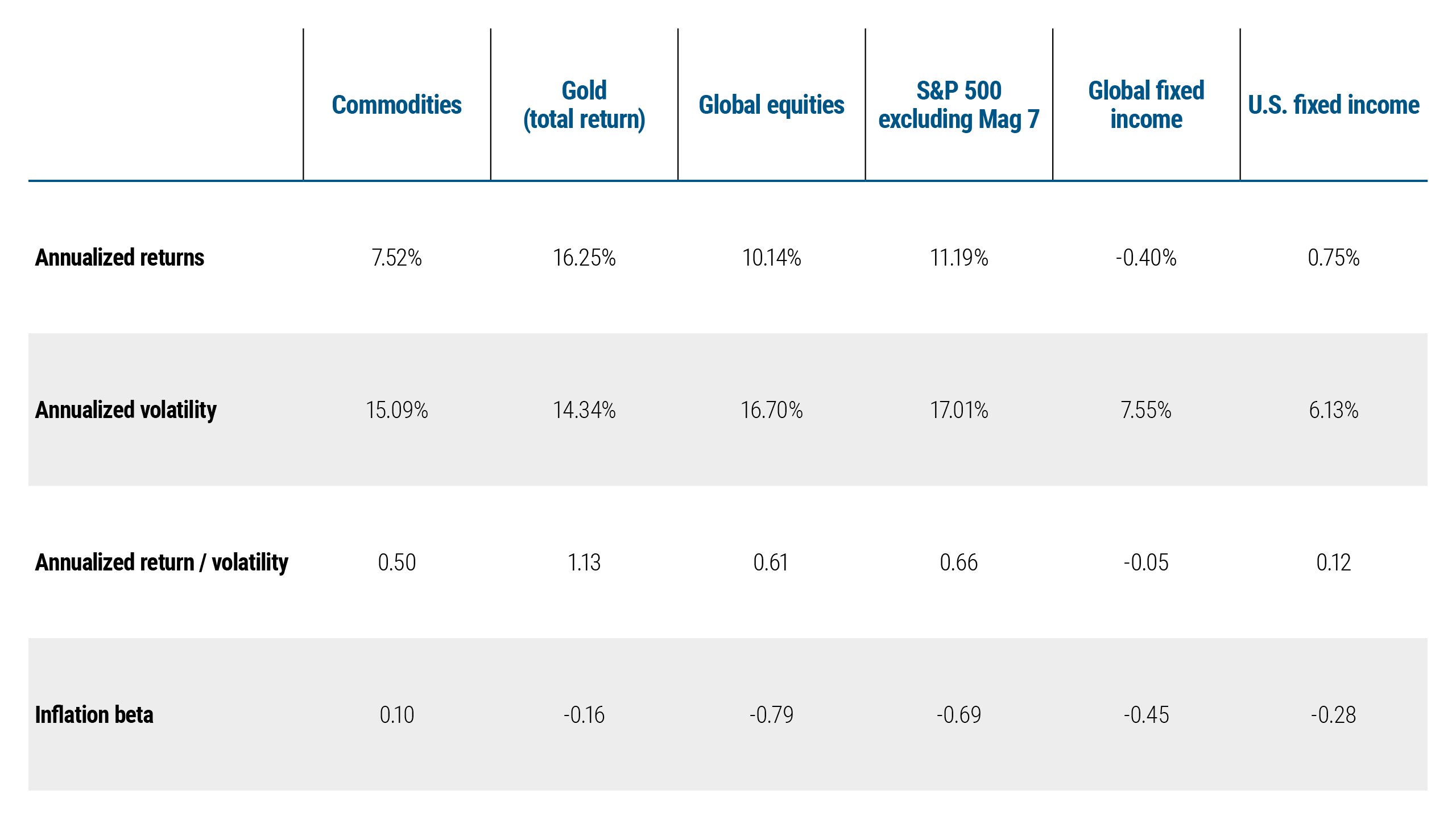 Source: Bloomberg and PIMCO data from 31 Dec. 2019 through 30 Sept. 2025. Asset class proxy indices are as follows: commodities – Bloomberg Commodity Index Total Return; gold – Bloomberg Gold Total Return Index; global equities – MSCI World Index - Global Equities; S&P 500 (proxy for U.S. equities) excluding “Magnificent 7” tech firms; global fixed income – Bloomberg Global Aggregate Total Return Index; U.S. fixed income – Bloomberg US Agg Total Return Index. Inflation beta is defined as the sensitivity of an asset’s return to inflation surprises.