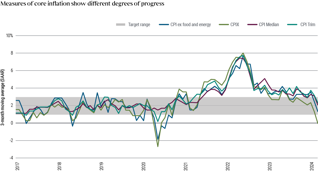 We anticipate the Bank of Canada (BOC) will start reducing interest rates around midyear, as Canadian inflation slows toward its target. We estimate the underlying inflation trend to have fallen below the top end of the BOC’s 1%–3% inflation range by the end of 2023, and with economic growth stagnating in recent quarters, we believe further labor market easing will give the BOC the confidence to begin easing by midyear.
