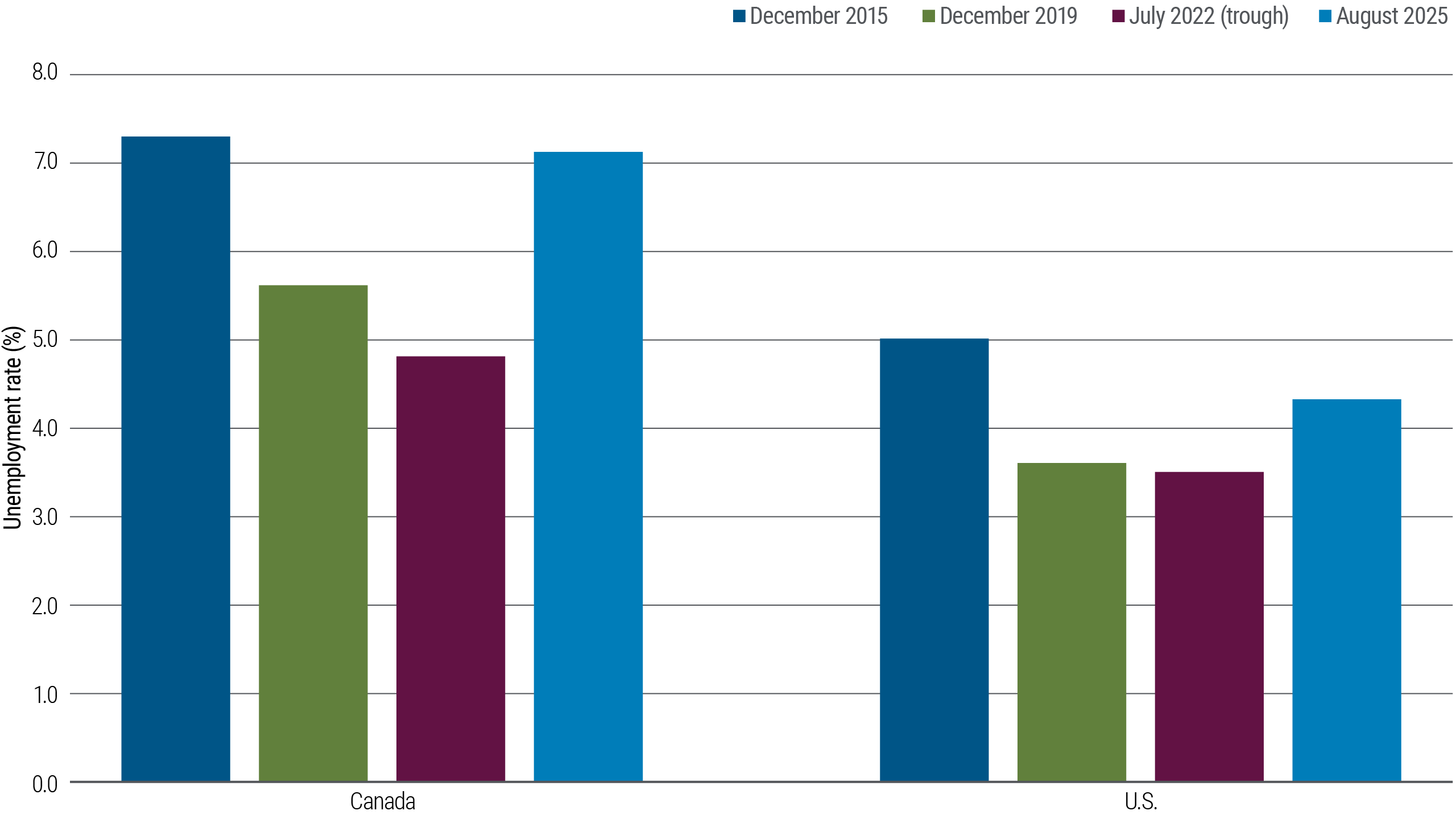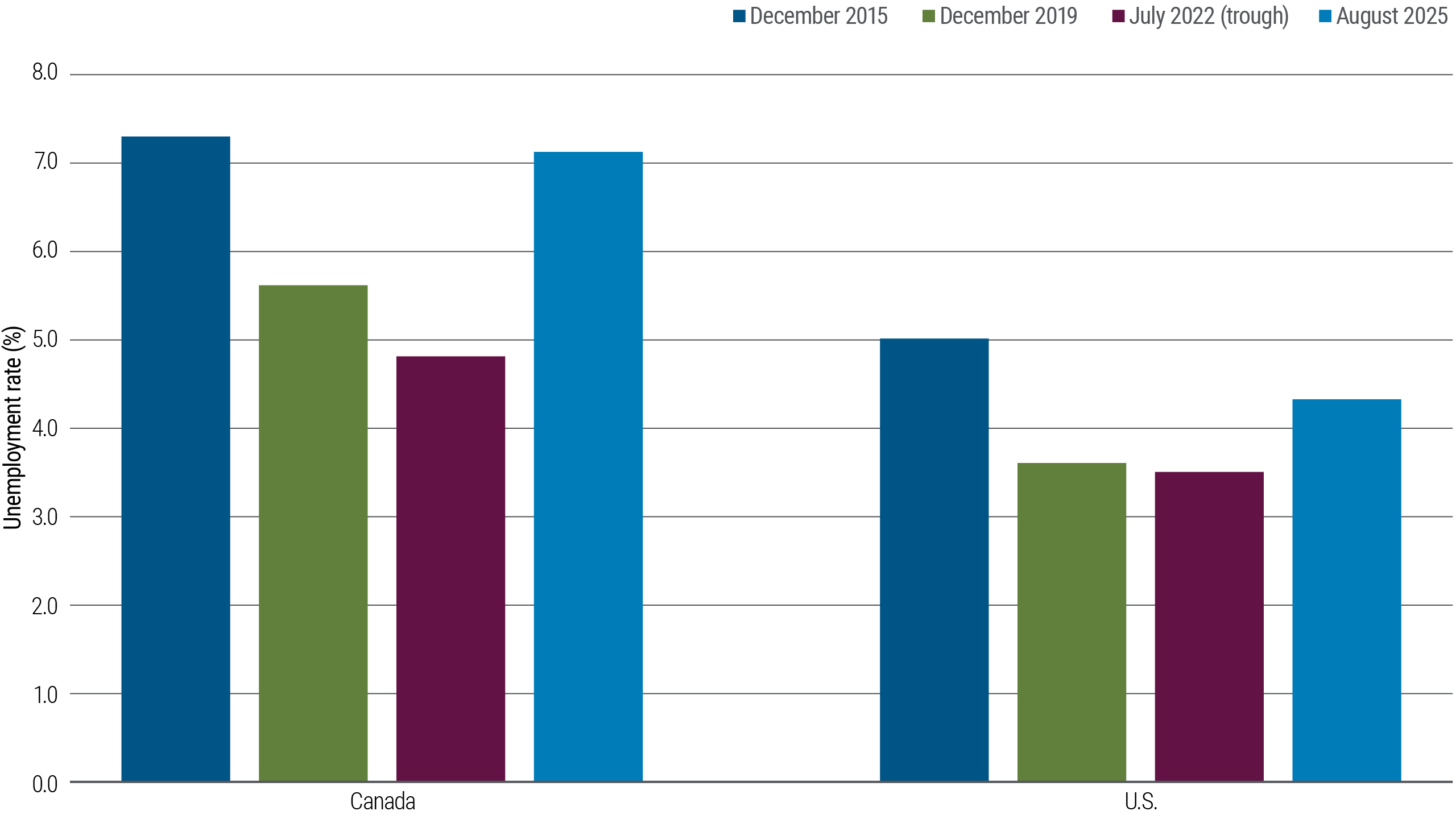 In addition to moderating inflation, we see continued downside risks to growth and employment in Canada. The ongoing reduction in immigration adds another headwind to the economy, stalling population growth in stark contrast to the nearly 3% annual population growth StatCan reported in 2023 and 2024. Despite this putting downward pressure on labour supply, the unemployment rate is still near its post-pandemic high of 7%, a level similar to the recessionary period of 2015 (see Figure 1).