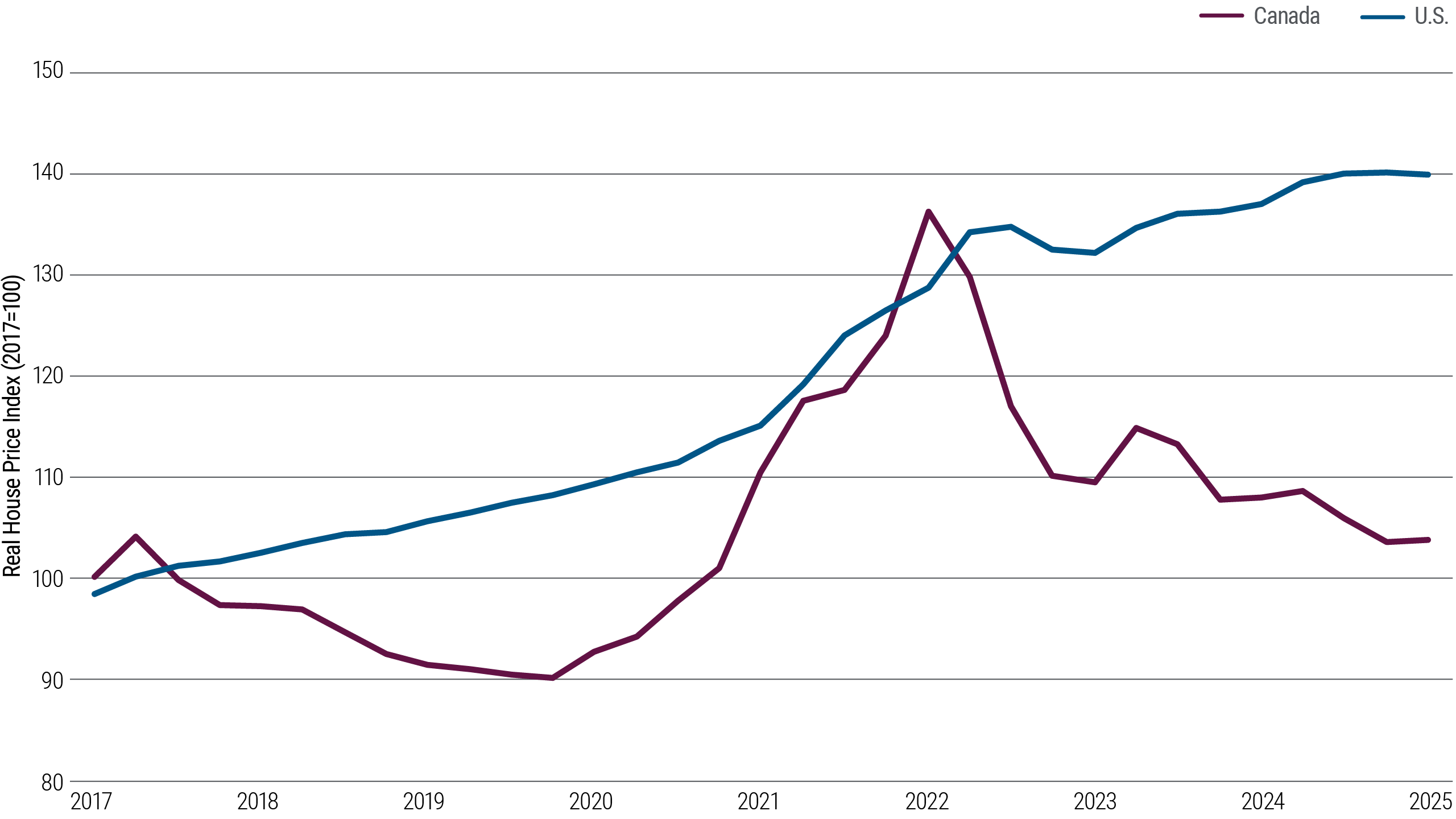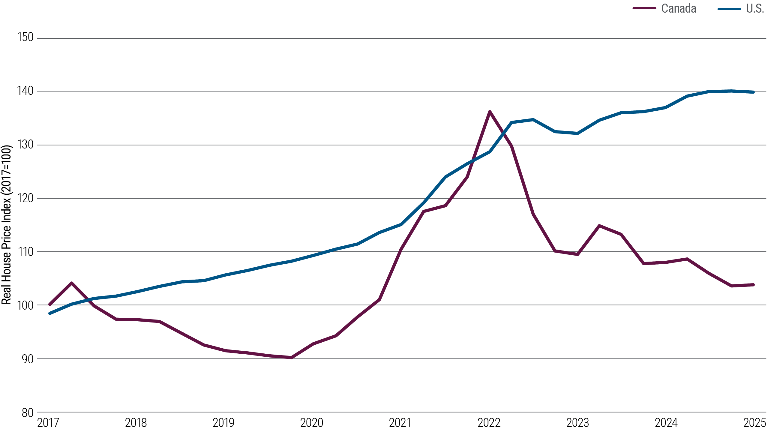 Finally, despite over 200 bps of policy rate cuts to date, Canadian households face financial strain with the debt service ratio over 14% (versus 11.25% in the U.S.), and almost 35% of outstanding mortgages poised to see payments increase by the end of 2026, according to a Bank of Canada Staff Analytical Note. The housing market, particularly in Ontario, remains under pressure, and we worry about the negative wealth effects of softer house prices in an economy that has tied consumer wealth to housing equity (see Figure 2).