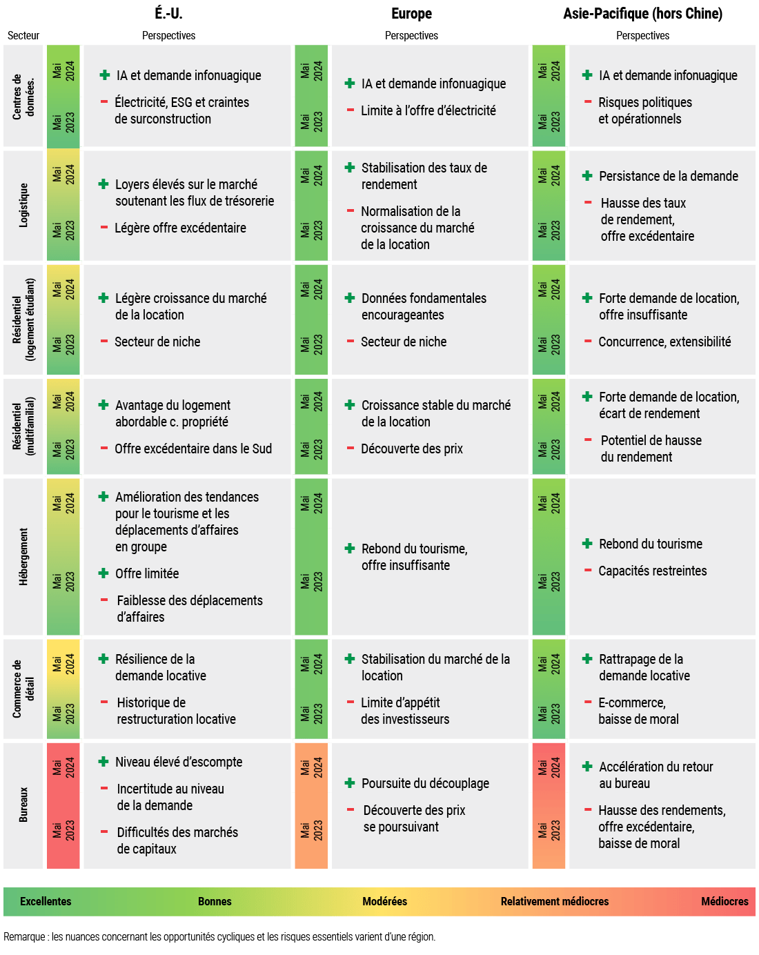 Il faut également tenir compte du risque géopolitique. Les conflits en Ukraine et au Moyen-Orient, les tensions entre les États-Unis et la Chine, ainsi que d’importantes élections cette année exacerbent l’incertitude, d’autant plus que le changement climatique alimente des inquiétudes croissantes qui affectent directement l’investissement et le développement de l’immobilier commercial.
