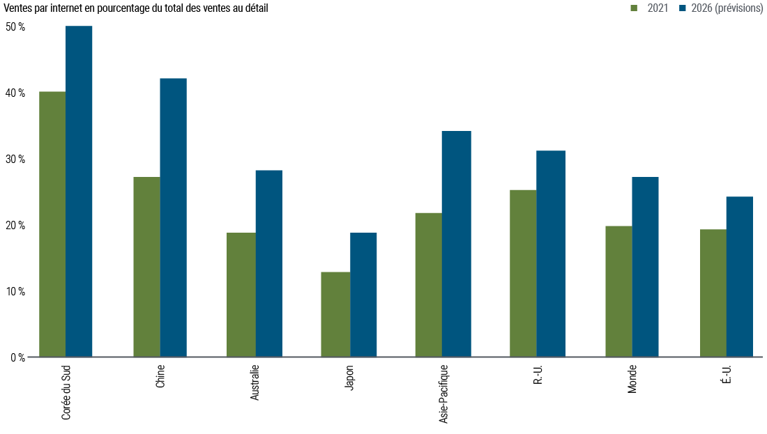 Dans la région Asie-Pacifique, les ventes en ligne devraient passer d’environ 20 % du total des ventes au détail en 2021 à près de 40 % en 20264. En outre, la démondialisation continue d’encourager une tendance à la relocalisation dans le territoire national ou dans des pays amis. Le Vietnam et l’Inde profiteront de cette tendance, du fait d’un délaissement de la production en Chine par les sociétés étrangères, tandis que la relocalisation à l’interne profitera au Japon et à la Corée du Sud.