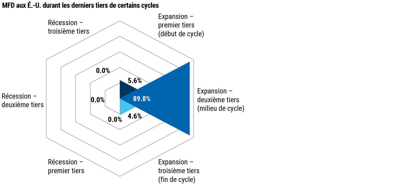 Dans l'ensemble, nous estimons que l'économie a atteint le milieu du cycle (voir graphique 1), comme en témoignent les valorisations boursières à notre avis. Historiquement, ces périodes ont généré des rendements soutenus pour les actions, mais disparates. Les instruments de crédit tendent à s'apprécier également dans ce contexte, tout en restant généralement distancés par les actions en termes ajustés au risque. À l'inverse, le dollar américain s'est souvent déprécié durant ces périodes.