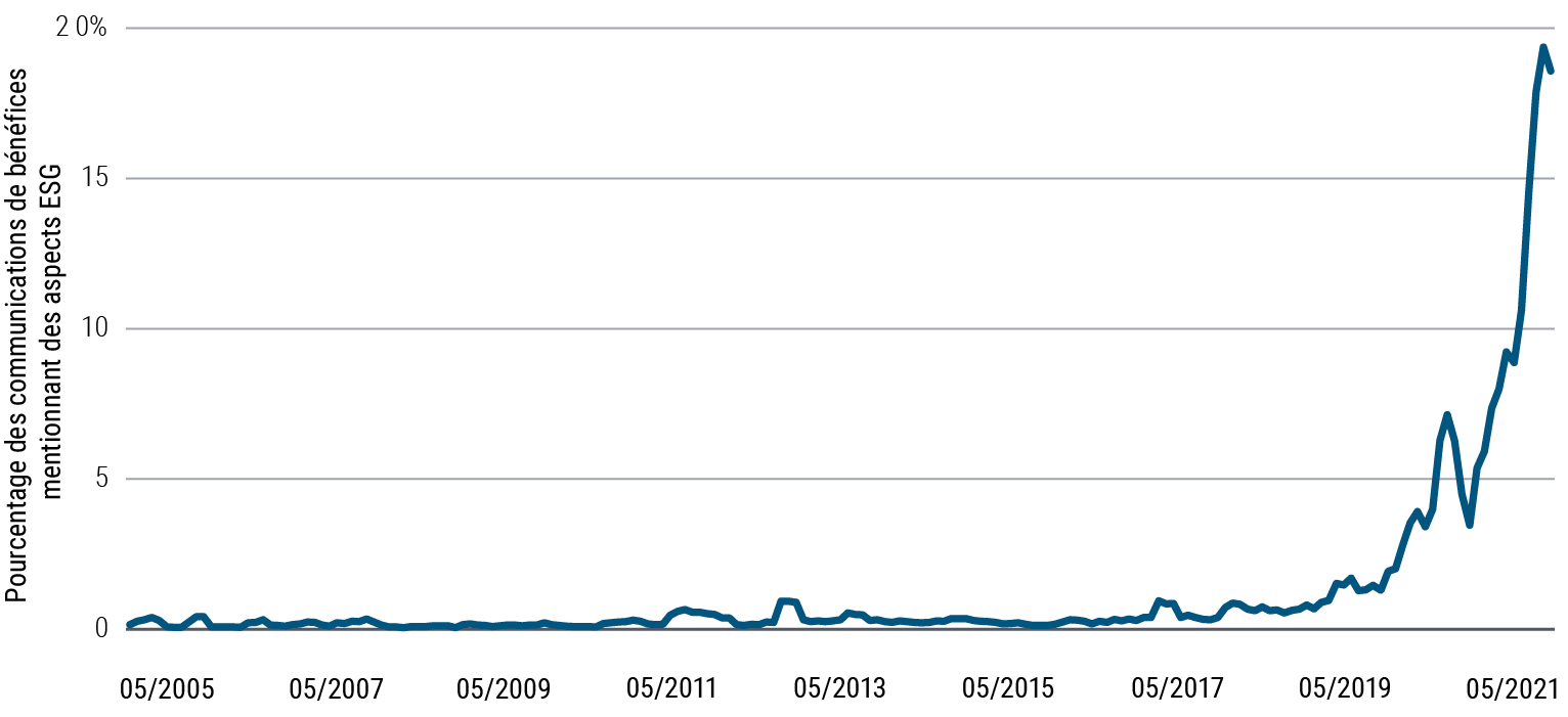 Qu’est-ce qui pourrait changer cette fois-ci? L’investissement environnemental, social et de gouvernance (ESG) constitue une tendance en plein essor dans cette phase de milieu de cycle. Le nombre de conférences téléphoniques lors des annonces de résultats des sociétés qui font mention de questions ESG a fortement augmenté depuis le début de la pandémie (voir graphique 2). Une représentation de ces dimensions ESG contribue à définir une stratégie de répartition de l'actif pertinente.