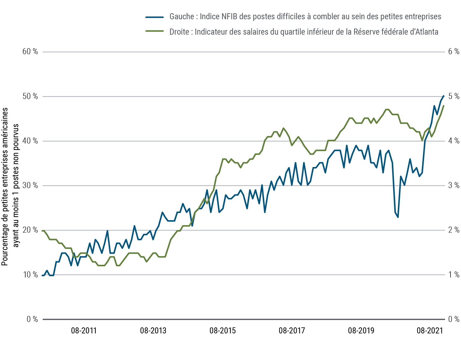 Les investisseurs doivent composer avec les effets structurels de la pandémie sur l’économie mondiale. Les conséquences les plus visibles se font particulièrement sentir sur le marché de l’emploi, avec des facteurs temporaires et permanents qui ont mené à des pénuries de main-d’œuvre. Les craintes persistantes à propos de la COVID-19, les mesures d’aide aux particuliers et les difficultés liées aux garderies et aux écoles dans cette situation sanitaire ont effectivement limité l’offre de main-d’œuvre en 2021, mais ces difficultés devraient se dissiper rapidement, à condition que l’efficacité des vaccins se prolonge, que les conséquences économiques des variants demeurent bien maîtrisées et que les écoles restent ouvertes. La fin des mesures d’indemnisation du chômage devrait en outre encourager le retour au travail si l’on se fie aux chiffres. À moyen terme, les restrictions entourant l’immigration risquent de peser sur ces perspectives.