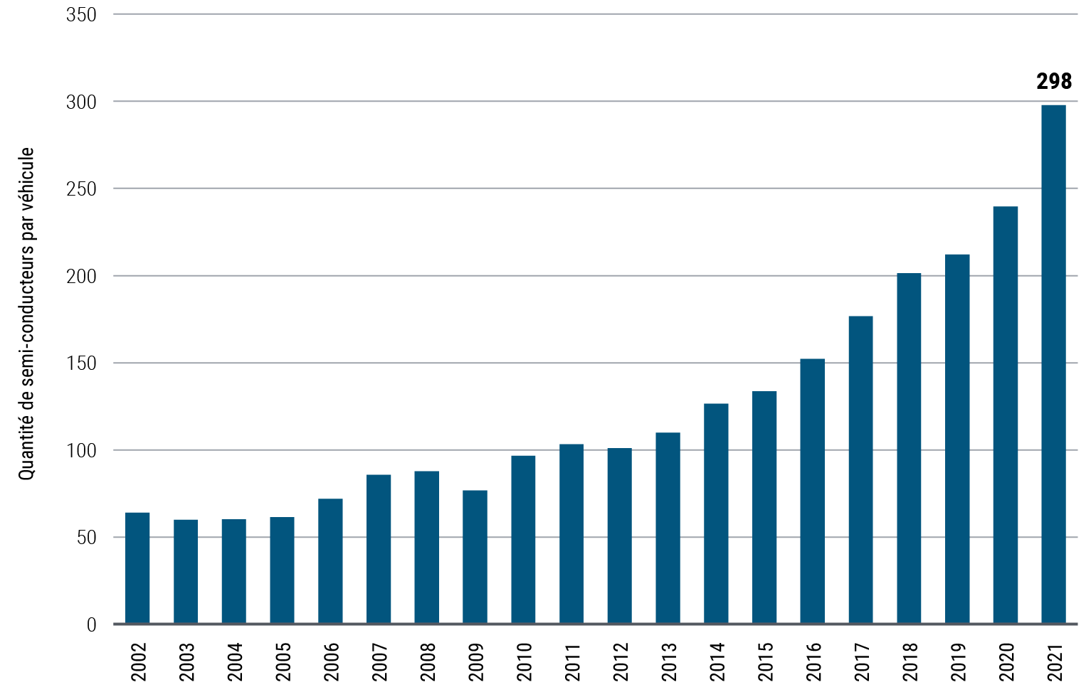 Toutefois, le secteur des semi-conducteurs présentait des fragilités avant même que la COVID fasse irruption. Le rythme exponentiel auquel les consommateurs ont acheté de nouveaux véhicules (notamment électriques), téléphones (5G) et autres appareils connectés a alimenté une demande massive que nombre de dirigeants d’entreprise et analystes dans ce secteur ont sous-estimée. Le graphique 2, par exemple, met en évidence l'augmentation significative du nombre moyen de semi-conducteurs dans les nouveaux véhicules. Abstraction faite des difficultés strictement liées à la pandémie, nous nous attendons à ce que la demande continue d’accélérer à un rythme soutenu, alors que les nouvelles capacités de production n’entreront en service que plus lentement. La plus importante fonderie au monde estime que le marché demeurera endémiquement tendu en raison de la croissance de la demande provoquée par les nouvelles applications, incluant celles pour les énergies vertes, le métavers et l’automatisation. À notre avis, les investisseurs ne tiennent pas suffisamment compte des changements qui se dérouleront vraisemblablement au cours des prochaines années. Nous estimons que les fournisseurs de semi-conducteurs généreront des rendements différenciés.