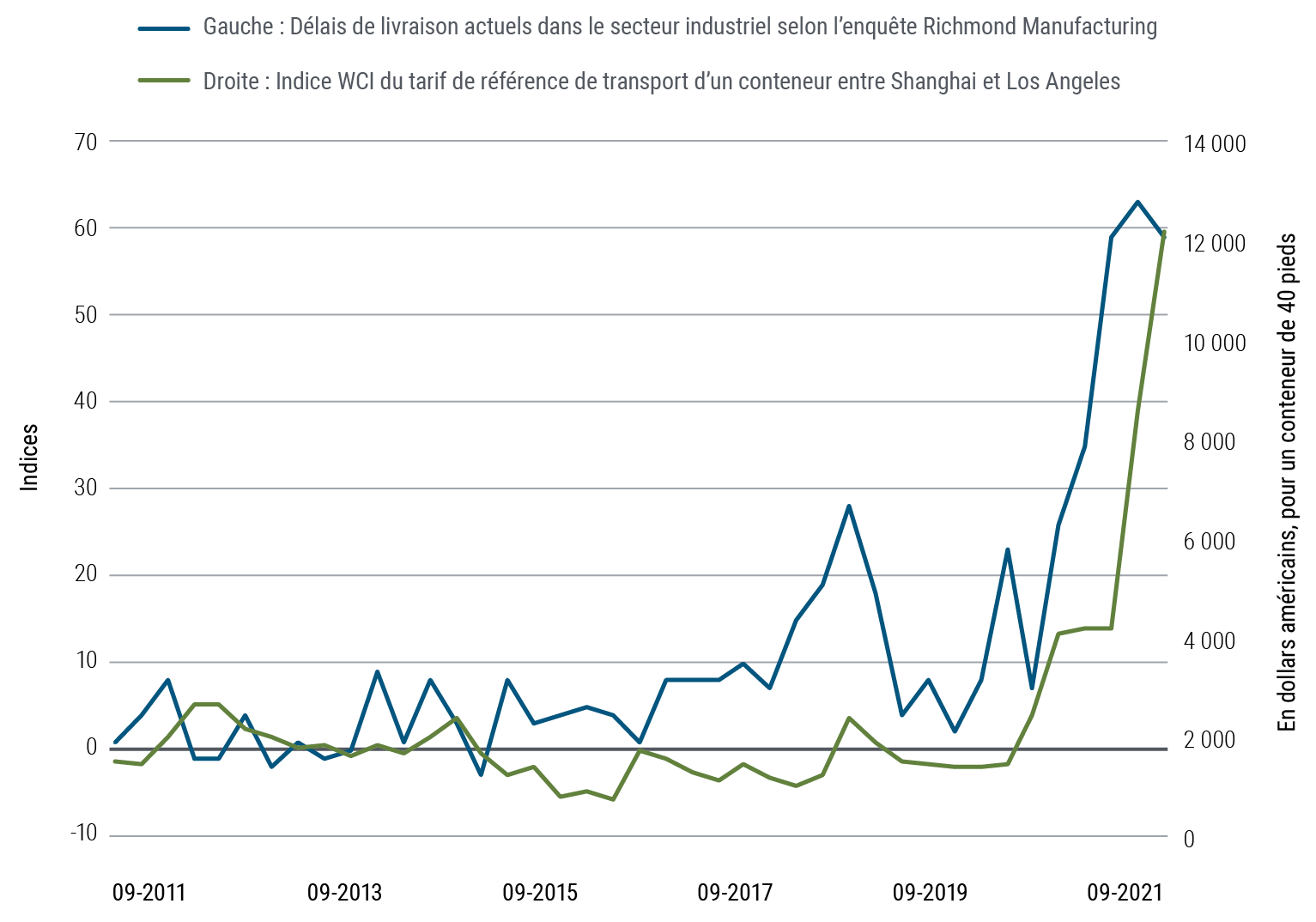 Les problèmes d’expédition ont largement contribué au déséquilibre entre l’offre et la demande cette année. Les consommateurs ont reporté leurs dépenses dans les services sur des achats de biens durant les périodes de confinement, déclenchant un fort rebond de la demande comme en atteste l’augmentation de 28 % depuis le début de la pandémie du volume des affrètements maritimes transpacifiques. La propagation du coronavirus a congestionné de nombreux itinéraires, d’autant plus que les problèmes se sont multipliés à l’échelle mondiale, en particulier dans le canal de Suez (avec un accident largement relayé dans les médias). Les politiques zéro-COVID en Chine ainsi que plusieurs catastrophes climatiques ont créé de sérieuses perturbations et les principaux terminaux portuaires mondiaux ont dû fermer. Ces événements ont aggravé les goulets d’étranglement dans le domaine du transport maritime avec une multiplication par 10 des tarifs d’expédition entre Shanghai et Los Angeles (graphique 3).