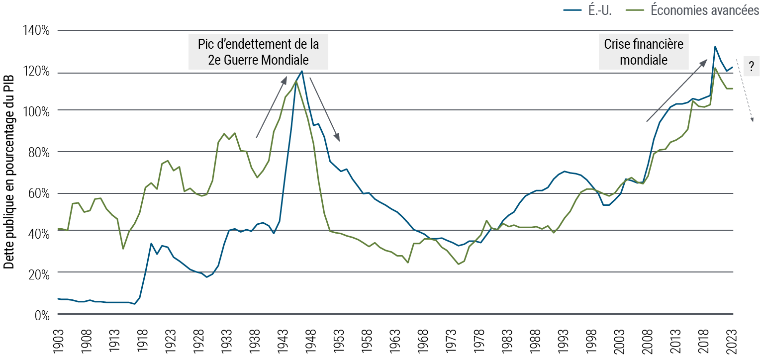 Le volume massif des emprunts d’État relativement au PIB dans les économies les plus avancées (voir figure 1) causera vraisemblablement une accentuation des courbes des taux sur notre horizon séculaire, les investisseurs continuant d’exiger une rémunération plus élevée pour les obligations à plus long terme. On observe effectivement, notamment dans les futurs yields indexés à l’inflation ou dans les estimations des primes des bons du Trésor en fonction des échéances, que les marchés reflètent déjà en partie cet ajustement, avant même que les banques centrales aient commencé à abaisser leurs taux (pour en savoir plus, veuillez consulter notre article, « Will the True Treasury Term Premium Please Stand Up? »).