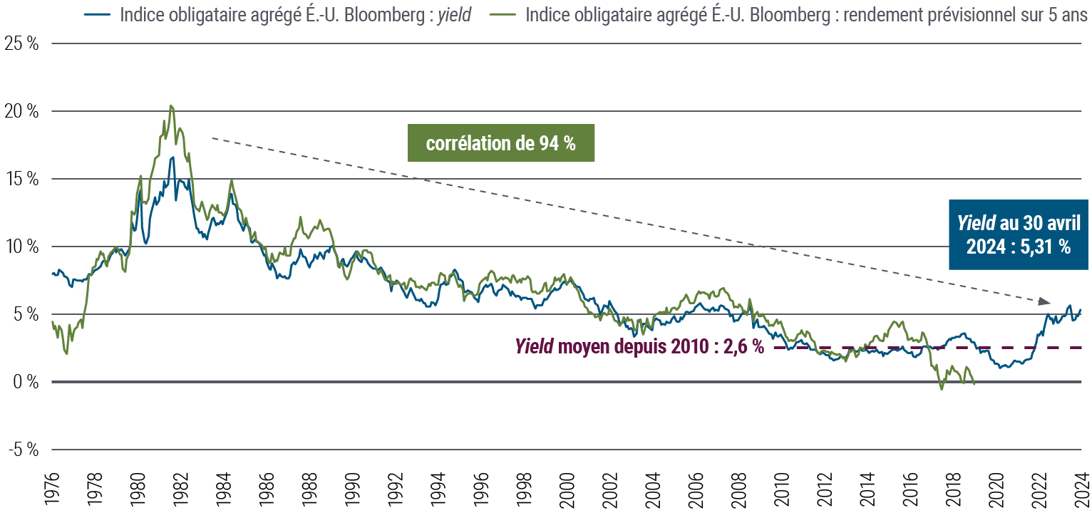 Le choc inflationniste d’après pandémie et le cycle de relèvement musclé des taux directeurs qui a suivi ont réinitialisé les yields obligataires substantiellement à la hausse. Les yields initiaux ont historiquement conditionné les rendements obligataires sur un horizon pluriannuel (voir figure 2). Les yields des indices agrégés américain et mondial Bloomberg (couverts en $ US), deux représentations courantes des obligations de qualité élevée, atteignaient respectivement 5,31 % et 5,41 % le 30 avril dernier.