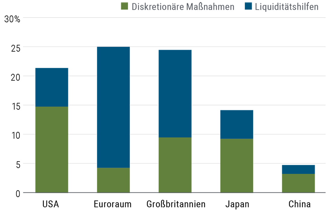 Die Wirtschaftspolitik ist ein weiterer ausschlaggebender Faktor, der sowohl positive als auch negative Überraschungen bereithalten könnte. Bislang wurden signifikante geld- und fiskalpolitische Hilfspakete geschnürt, was der zügigen Reaktion der politischen Entscheidungsträger im Frühjahr 2020 zu verdanken ist (siehe Abbildung 1). Diese zeitnahen expansiven Maßnahmen und Liquiditätsspritzen, die wir in unserem Ausblick zur Jahresmitte erörtert haben, trugen zur Beruhigung der Märkte bei und hatten eine markante Gegenbewegung der Vermögenspreise zur Folge.