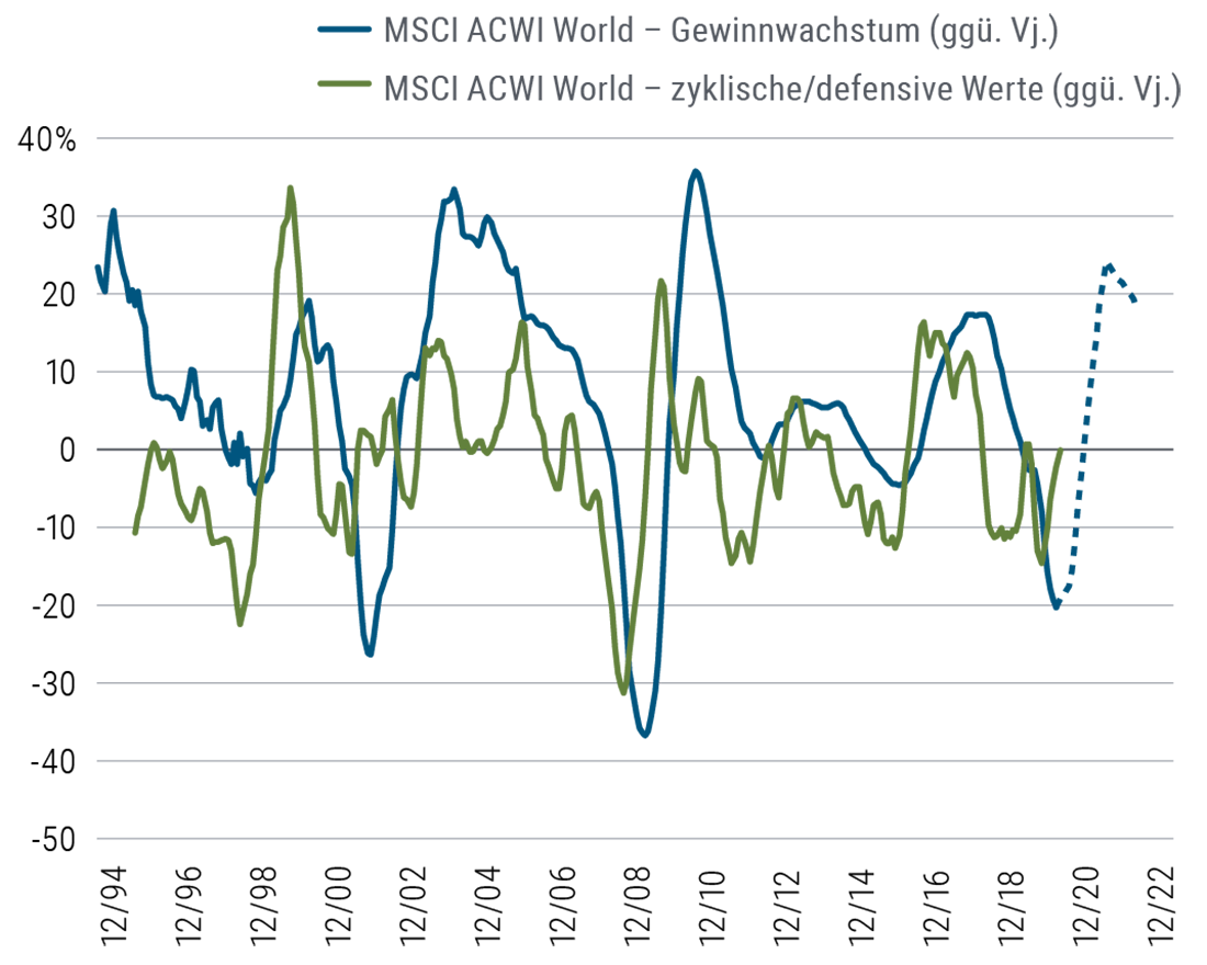Mit Blick auf die letzten zwölf Monate sind wir – eher abrupt – von einem spätzyklischen Umfeld im Dezember 2019 in ein frühzyklisches Umfeld im Dezember 2020 geraten. Ende 2019 waren wir noch um die Wachstumsverlangsamung, die überteuerten Bewertungen und den hohen Verschuldungsgrad der Unternehmen besorgt. Auch wenn fast niemand, einschließlich uns, vorhersehen konnte, wie sich die Pandemie in unterschiedlichen Regionen der Welt entwickeln würde, haben ihre Konsequenzen die Weltwirtschaft in weniger als einem Jahr in einem völlig anderen Zustand hinterlassen. Während die Gesamtwirtschaft in eine frühzyklische Phase übergeht, ist unseres Erachtens mit einer Beschleunigung des Gewinnwachstums zu rechnen, obgleich die Geschwindigkeit und das Ausmaß des Aufschwungs angesichts der beiden gegenläufigen Kräfte – der verhaltenen Wirtschaftsaktivität und dem Rekordumfang der geld- und fiskalpolitischen Hilfsprogramme – nach wie vor äußerst ungewiss sind.
