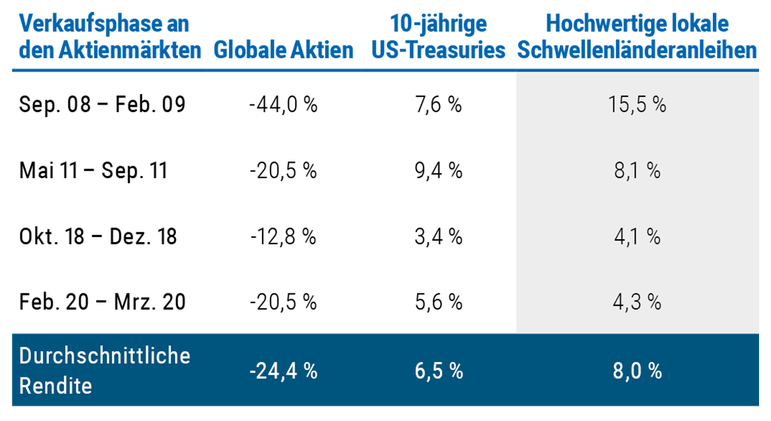 Unseres Erachtens bleiben qualitativ hochwertige Durationspositionen (Staatsanleihen) eine zuverlässige Diversifikationsquelle, um uns gegen einen Wachstumsschock abzusichern, auch wenn ihre Renditen auf historisch niedrigem Niveau rangieren. In diesem Zusammenhang haben US-Staatsanleihen mehr Raum nach oben als die meisten ihrer Industrieländer-Pendants und dürften bei einer Flucht in sichere Anlagen nach wie vor der Vermögenswert erster Wahl sein; entsprechend halten wir in unseren Multi-Asset-Portfolios an einer Übergewichtung fest. Des Weiteren favorisieren wir ausgewählte Staatsanleihen aus Schwellenländern, unter anderem aus Peru und China, die Renditevorteile bieten und in Phasen der Risikoscheu tendenziell gut abschneiden (siehe Abbildung 5).