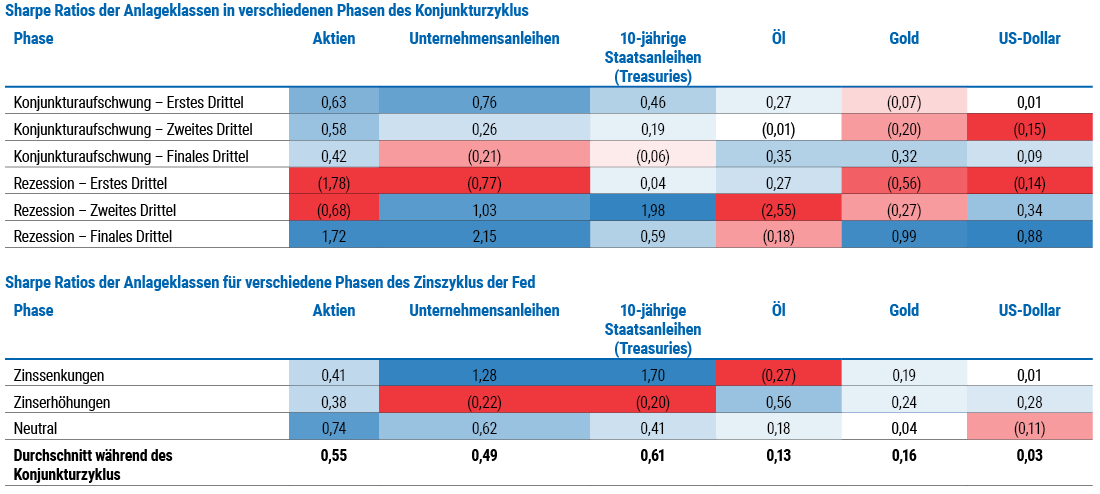 Abbildung 4 zeigt, dass Kreditpapiere/Anleihen beim Übergang von der Expansion in der Spätphase zur Rezession in der Regel die ersten Risiko-Assets waren, die eine Underperformance aufwiesen, gefolgt von Aktien und Rohstoffen. Kreditpapiere/Anleihen waren auch die ersten Risiko-Assets, die sich wieder erholten. Dieser Prozess setzte etwa in der Mitte der Rezession ein und hielt während der Frühphase einer Expansion an. Durations-Papiere (also Investments in zinssensitive Anlageklassen wie Staatsanleihen, wie sie in Abbildung 4 durch zehnjährige US-Treasuries dargestellt werden) haben einem Portfolio in den frühen Stadien einer Rezession normalerweise nicht viel Puffer geboten und erst dann eine Outperformance erzielt, wenn sich die Rezession verschärfte. Das Verständnis dieses Verhaltens von bestimmten Anlageklassen ist der Schlüssel zur Neupositionierung von Portfolios während des gesamten Konjunkturzyklus. Im Gegensatz dazu zeigten die Zinszyklen der US-Notenbank in der Vergangenheit eine geringere Korrelation zur Aktien-Performance, hatten aber direktere und deutlichere Auswirkungen auf die (Markt-)Zinsen und den US-Dollar.