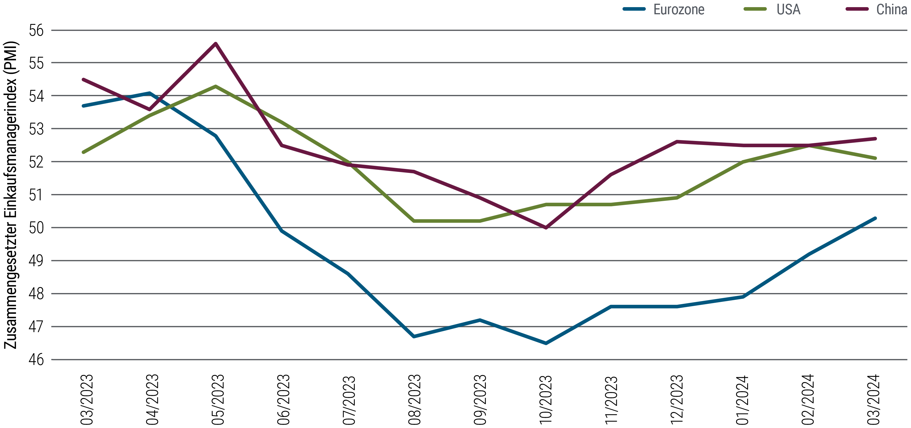 Neben der Stärke der US-Wirtschaft sind auch andernorts erste Anzeichen eines potenziellen baldigen Aufschwungs zu erkennen, nachdem das Wachstum vieler industrialisierter Volkswirtschaften im Jahr 2023 durchweg stagniert hatte oder leicht rückläufig war. So ging es in einigen Regionen bei den Einkaufsmanagerindizes (PMIs) – einem wichtigen makroökonomischen Indikator für die Wirtschaftsaktivität – in den vergangenen Monaten wieder aufwärts (siehe Abbildung 1). Grundsätzlich ist aber davon auszugehen, dass die USA der wichtigste Motor für das Weltwirtschaftswachstum bleiben, vor allem im Vergleich zu anderen Industrieländern.