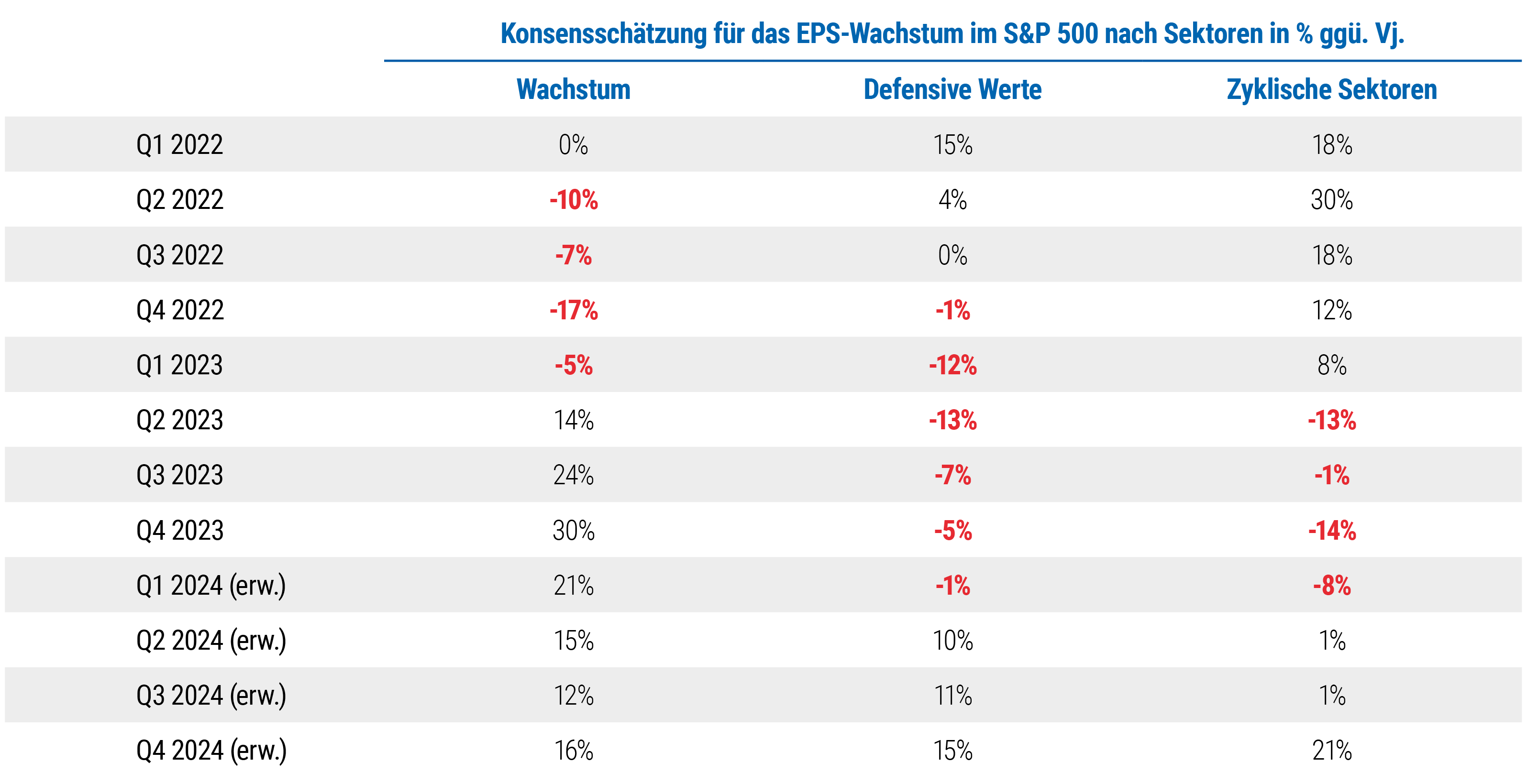 Tatsächlich durchliefen die Wachstumswerte im US-Aktienindex S&P 500 (der von Tech-Firmen dominiert wird) im Verlauf von 2022 eine solche EPS-Rezession, bevor sie sich im Jahr 2023 wieder erholten, als der Gewinn je Aktie in den meisten anderen Sektoren zurückging (siehe Abbildung 2). Für 2024 erwarten wir, dass defensive und zyklische Werte die Zeit der Gewinneinbußen früher oder später hinter sich lassen, worauf möglicherweise deutliche Kurssteigerungen folgen.
