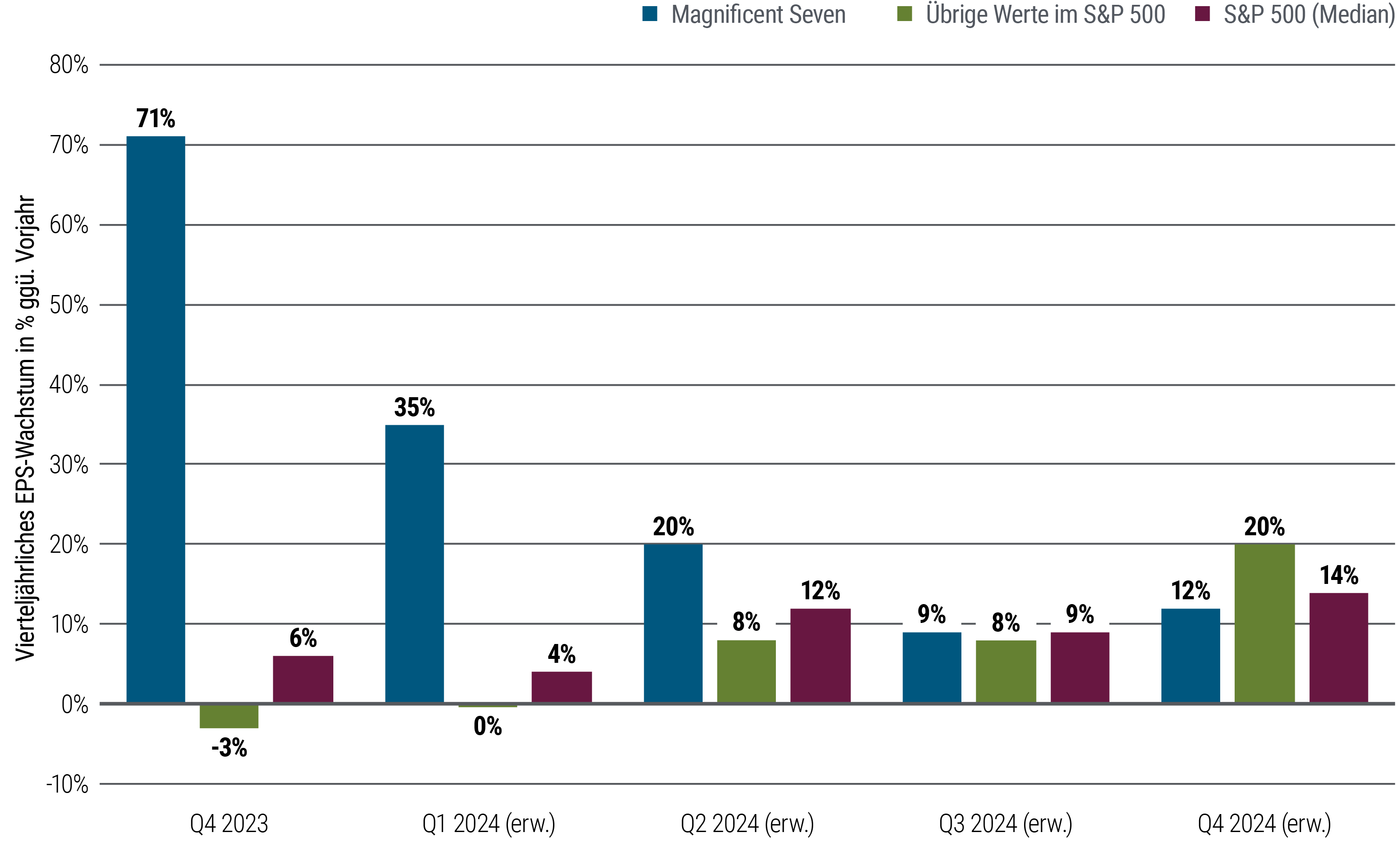 Im Verlauf dieser rollenden Rezessionen und Erholungen könnten sich die EPS-Wachstumsraten der Spitzenreiter und der Nachzügler im S&P 500 wieder annähern. Denn während die „Magnificient Seven“-Technologiewerte im vierten Quartal 2023 ein EPS-Wachstum von 71 Prozent gegenüber dem Vorjahreszeitraum erfuhren, ist bis zum vierten Quartal 2024 mit einer Abschwächung auf zwölf Prozent zu rechnen (siehe Abbildung 3). Für die übrigen 493 Aktien wird im gleichen Zeitraum dagegen ein zunehmendes EPS-Wachstum prognostiziert – von minus drei Prozent auf plus 20 Prozent.