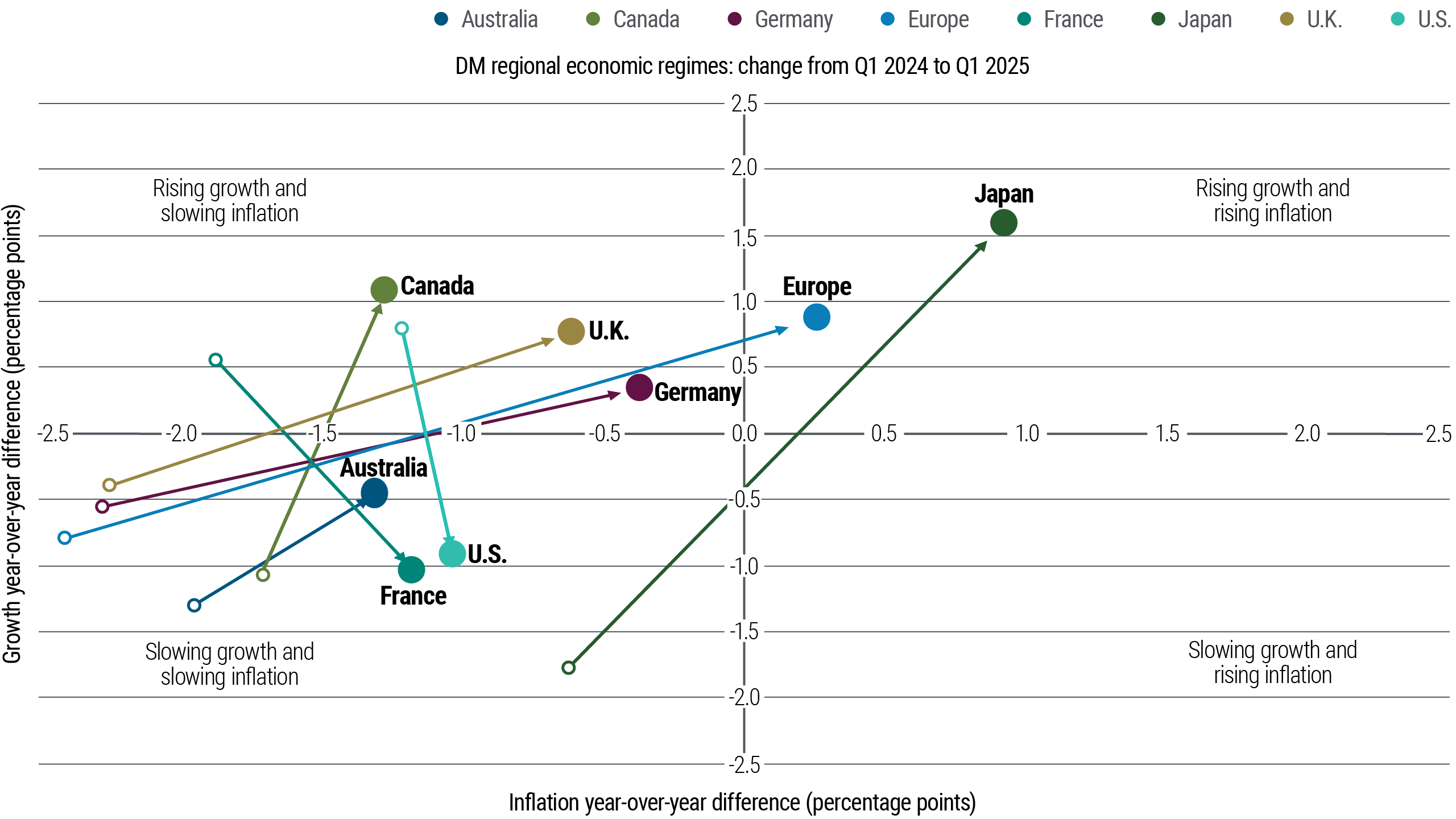 Source: Haver Analytics data and PIMCO calculations as of 9 June 2025. This chart is based on GDP and CPI data for each country or region. The 1-year change in each series is shown as a solid point along the two axes. Also shown (as a hollow circle) is each country’s status one year ago.